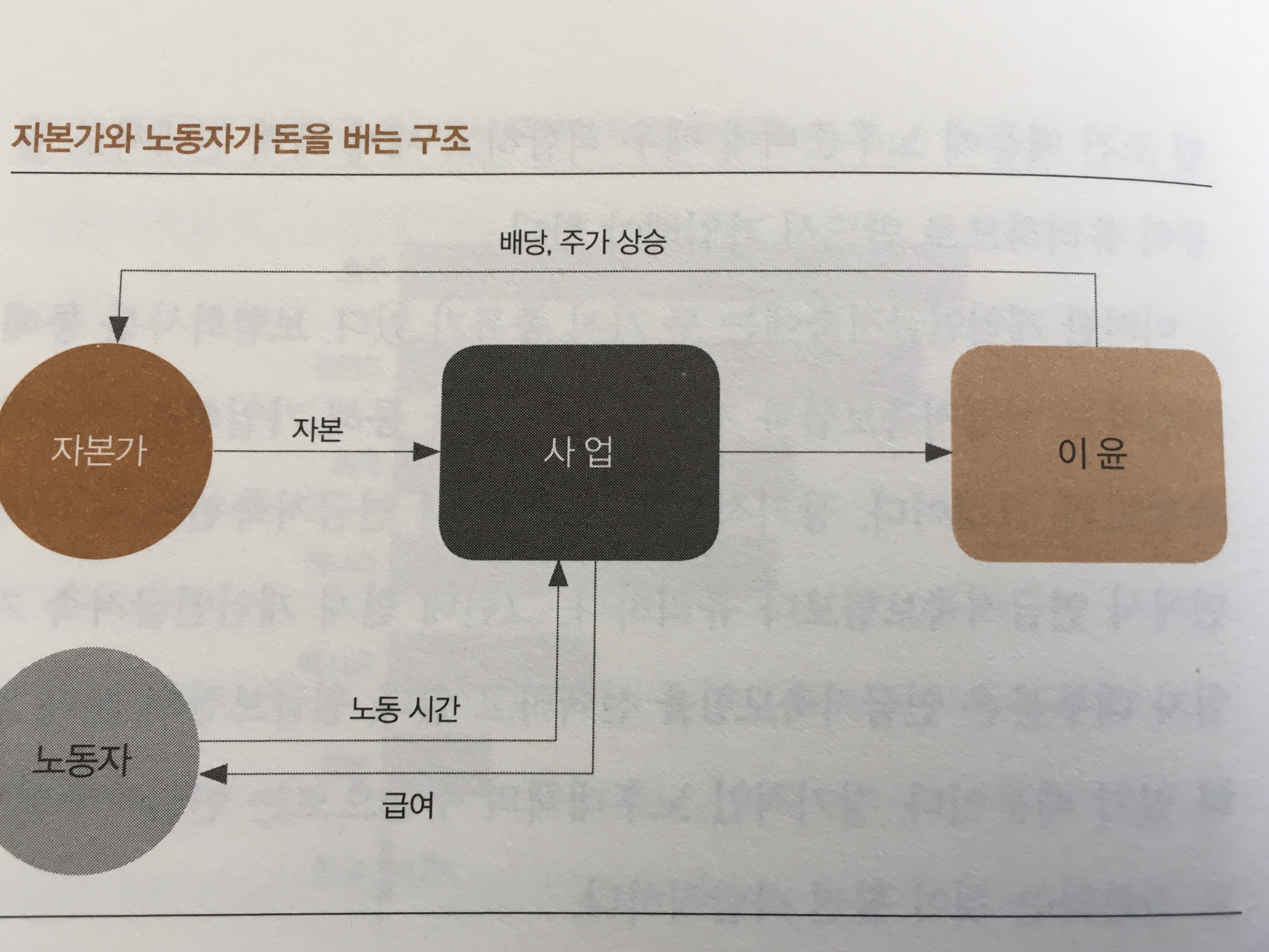 존리 대표는 경제독립을 이루고 나아가 부자가 되려면 노동자가 아닌 자본가가 돼야 한다고 주장한다. 책 90페이지에 자본가와 노동자가 돈을 버는 구조가 그림으로 들어가 있다. 최근 읽었던 여러 재테크 책에서 많이 본 그림이다. 자본가가 되는 가장 빠르고 확실한 방법은 창업이다. 하지만 현실적으로 쉽지 않고 주식투자를 통해서 노동자도 자본가가 될 수 있다고 한다.