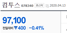 오늘자 컴투스의 주가는 97,100원이다. S-RIM에 의하면 이 종목은 적정주가 대비 저평가돼있다. 얼른 사러 가자. (증권투자는 반드시 자기 자신의 판단과 책임하에 하여야 하며, 자신의 여유자금으로 분산투자하는 것이 좋습니다.)