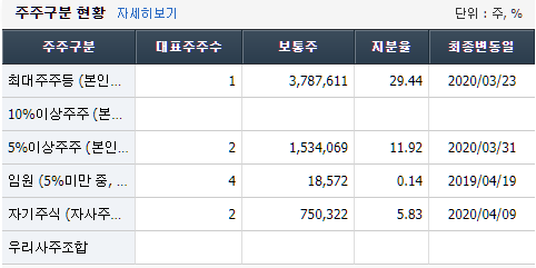 S-RIM에 의하면 이 종목(컴투스)의 기업가치는 약 15,617.8억원이다. 이제 이 값을 주식 수로 나누면 적정 주가가 나온다. 주식 수는 발행주식 수에서 자기주식을 차감해서 구한다. 다시 FnGuide 페이지로 돌아가서 '시세현황'과 '주주구분 현황' 항목을 선택한다.