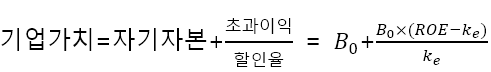 "재무제표 모르면 주식투자 절대로 하지마라"라는 책을 다 읽었다. 주식가치를 측정하는 여러 가지 방법 중 저자는 RIM을 선호한다고 한다. S-RIM은 저자가 RIM을 조금 변형시켜서 만든 방법이다. S는 특별한 의미는 없고 저자의 이름에서 따왔다고 한다. 책 말미에 실린 사례실습 챕터의 내용대로 관심종목의 목표주가를 산정해봤다. S-RIM의 수식은 다음과 같다.