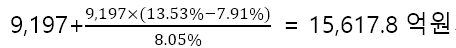 올해 예상 ROE는 13.53이다. 작년보다 예상 ROE 수치가 조금 높다. 이제 필요한 값을 모두 구했으니 S-RIM을 수식에 넣어 계산한다.