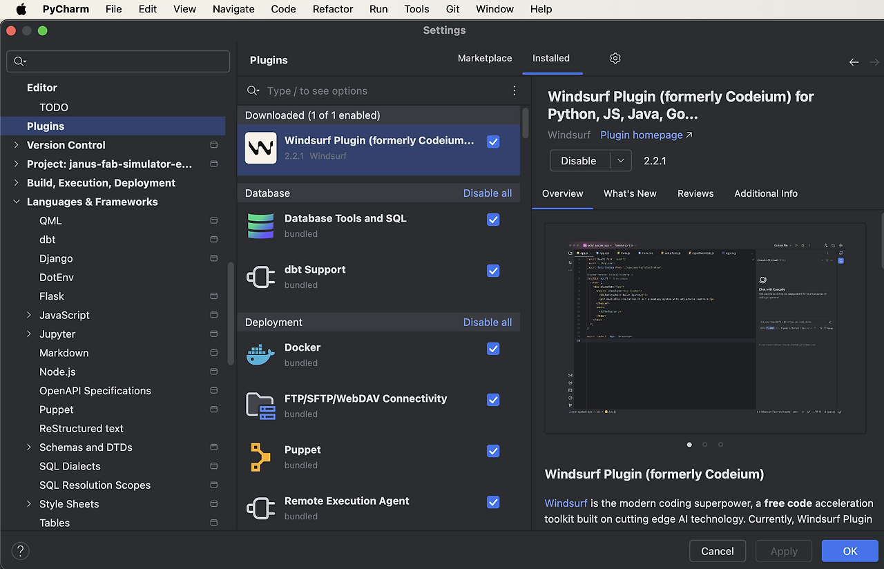 Windsurf Plugin을 설치하는 방법은 너무 간단한데요. PyCharm에서 Settings -> Plugins 메뉴를 열고 검색창에 windsurf를 입력해서 찾고 설치하면 끝입니다. 더 자세한 내용은 아래 Windsurf 메뉴얼 페이지를 참고해 주세요.