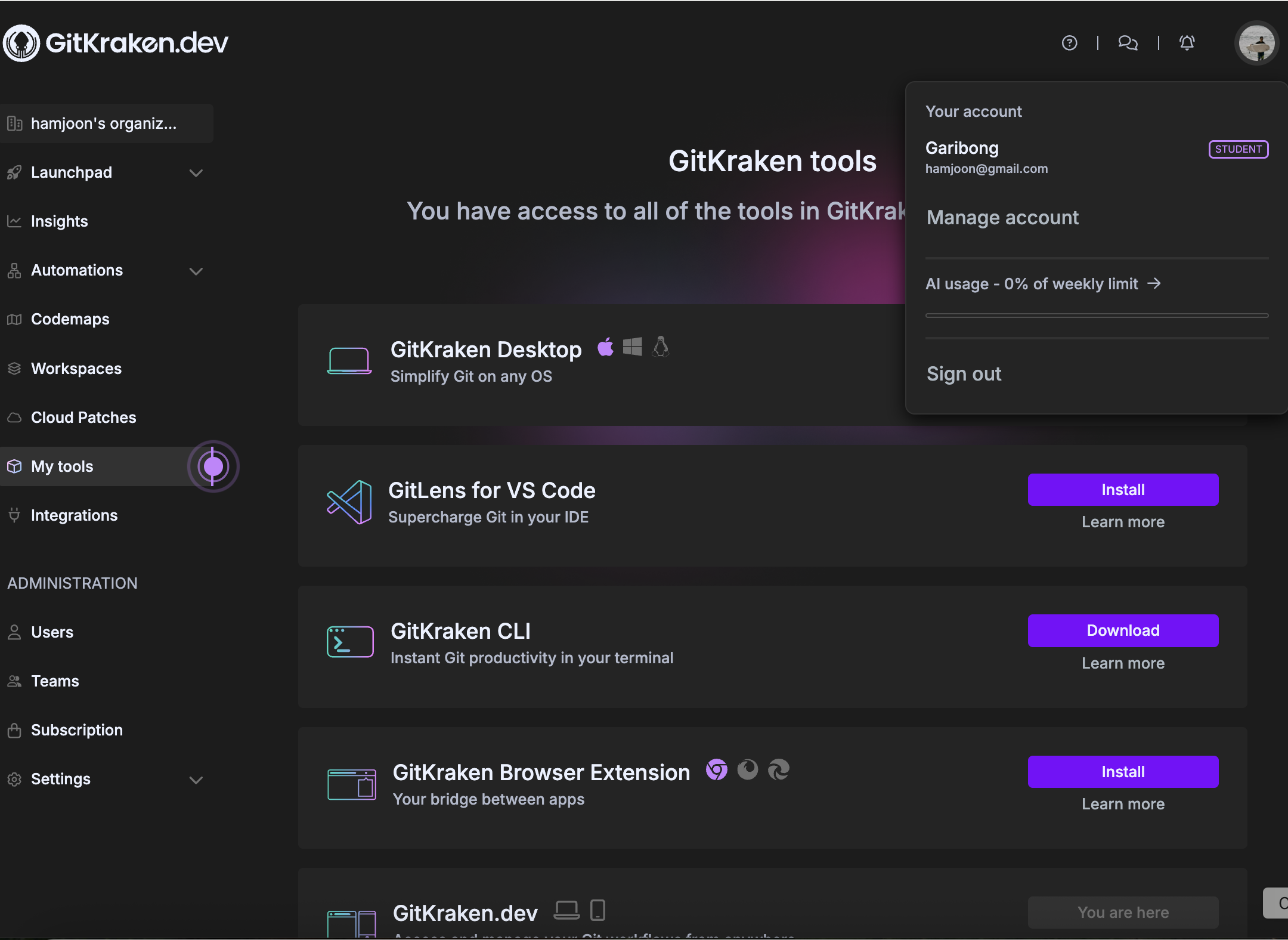 인증이 완료되면 GitKraken Desktop 무료 사용을 포함해서 위와 같이 다양한 혜택이 주어진다. 꽤 많은 서비스의 학생 플랜에 가입한 것 같은데 글을 다 쓰고 나니 네 가지뿐이다. 뭐가 더 있었는지 찾으면 2편을 이어서 쓰겠다. 끝.