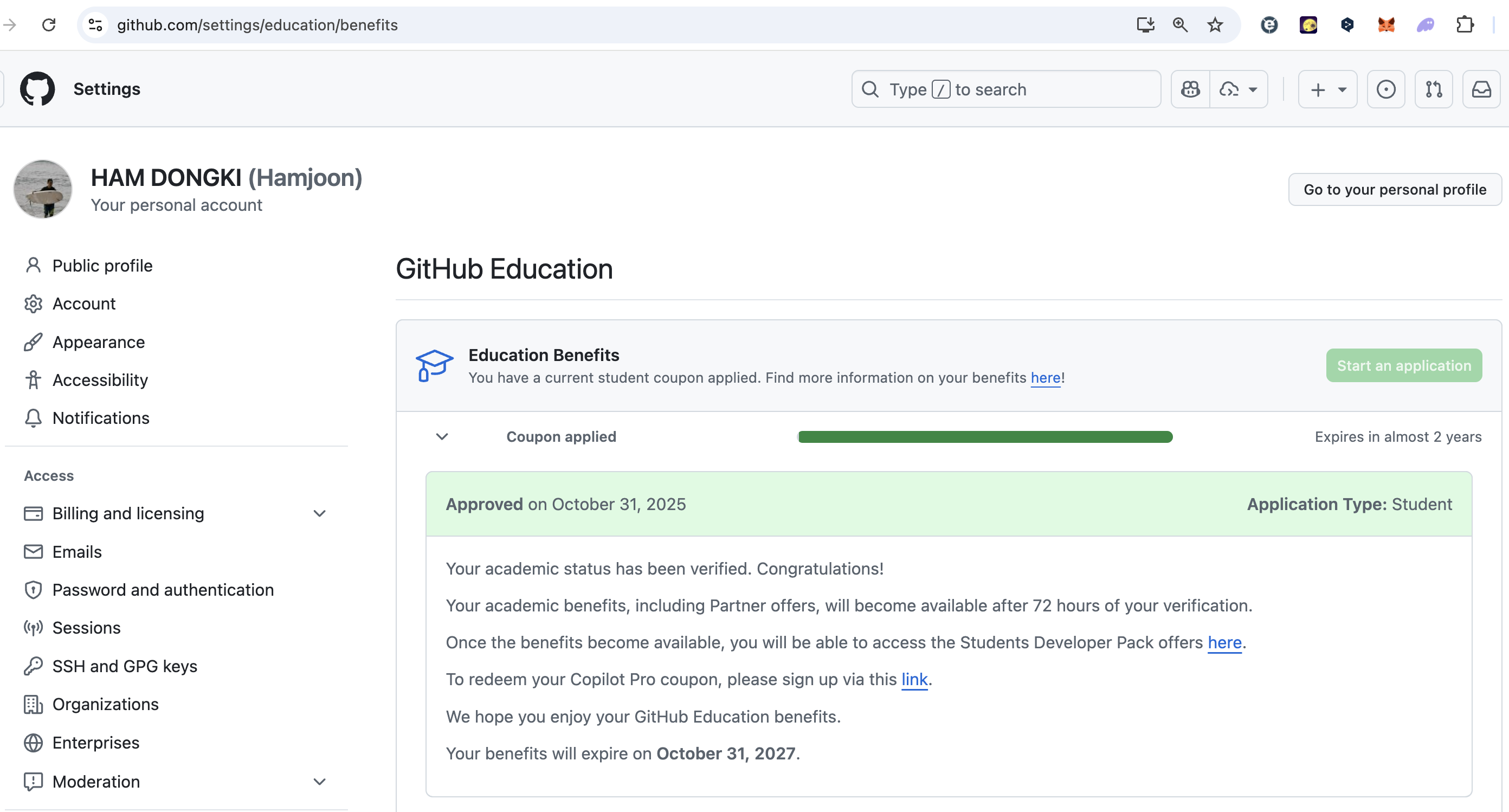 다음은 Github인데 학생 인증이 쉽지 않았다. 처음에 학생증 겸 체크카드의 뒷면을 찍어서 올렸는데 대략 현재 연도가 표시돼 있지 않고, 한국어로만 쓰여 있다는 이유로 reject 당했다. 깔끔하게 영문 재학증명서(내 돈 500원ㅠ) 뽑아서 올렸더니 승인됐다. 이렇게 인증에 성공해도 72시간이 지나야 기능이 활성화된다. 인증 과정이 힘든 만큼 혜택이 많은데 일단 Copilot Pro 쿠폰을 준다. 자세히 살펴보지 않아서 어느 정도 금액에 해당하는 쿠폰인지 아직 모르겠다.