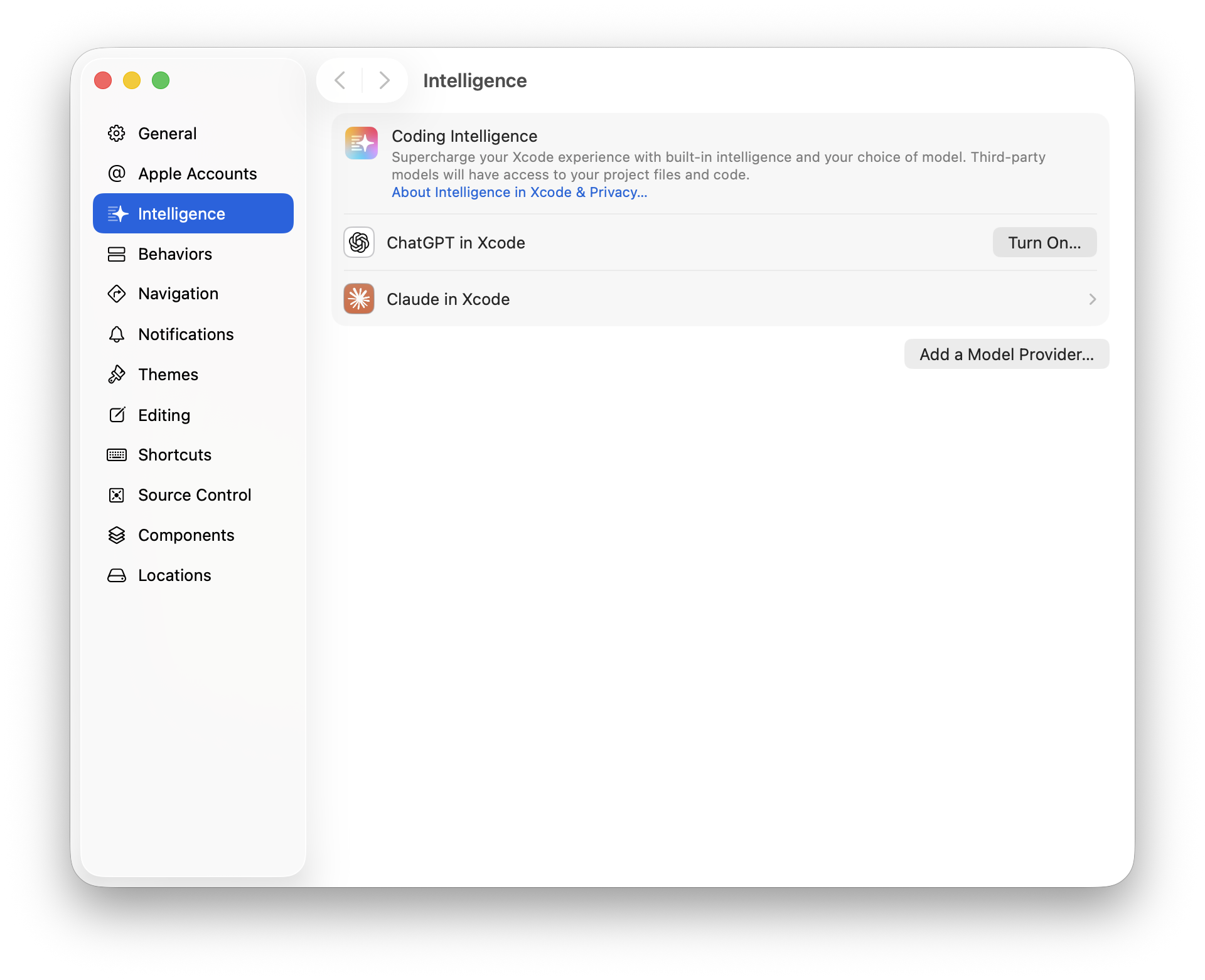 Xcode에서 Claude를 연동하고 싶어서 방법을 검색해 봤더니 Xcode 설정 창에서 Intelligence 메뉴로 들어가서 활성화하기만 하면 된다는 것이었다. 그런데 아래 이미지와 같이 Intelligence 메뉴 자체가 보이지 않았다.