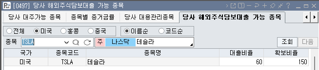 어제 일부 매도한 테슬라(TSLA)를 검색해 봤다. 대출비율과 확보비율이 정상적으로 표시되면 대출 가능한 종목이다. 대출 불가능한 종목도 조회 자체는 되는데 대출비율과 확보비율이 공란으로 표시된다.