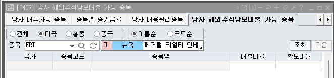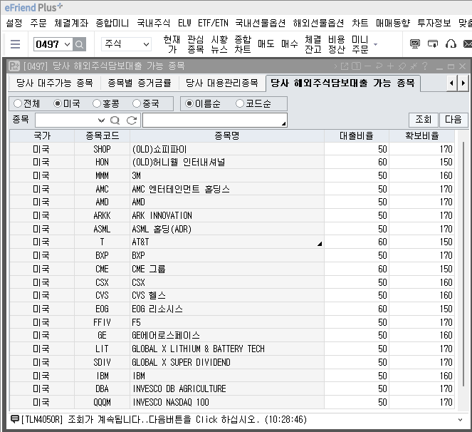 PC에서 eFriend Plus(한투 HTS) 프로그램을 실행하고 0497 메뉴로 들어가서 '당사 해외주식담보대출 가능 항목' 탭을 선택한다. 그러면 위 그림과 같이 가능한 전체 리스트가 쭉 표시된다.