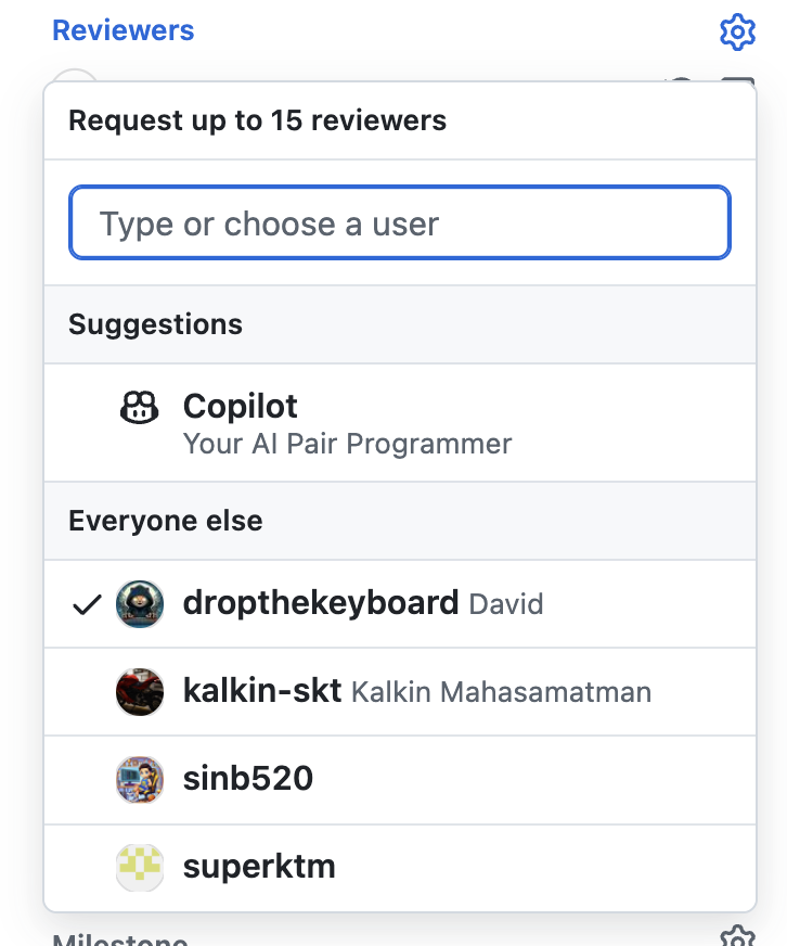 위 저장소는 얼마 전에 참여했던 2025 SKT Claude Code Hackathon 본선 과제로 제출한 프로젝트다. 심사는 github에서 private 저장소를 생성한 뒤 PR을 올리고 심사위원을 리뷰어로 지정하는 방식으로 진행됐다. 문득 생각이 나서 오늘 확인해 봤는데 아직도 PR이 통과되지 않은 상태로 머물러 있었다. 입상권인 3위 안에 들지 못해서 그런지 원래 그런 건지 이유는 알 수 없지만 찜찜했다. 별생각 없이 PR 페이지의 Reviewers 메뉴를 클릭해 봤는데 Copilot을 리뷰어로 추가할 수 있었다. 띠용~