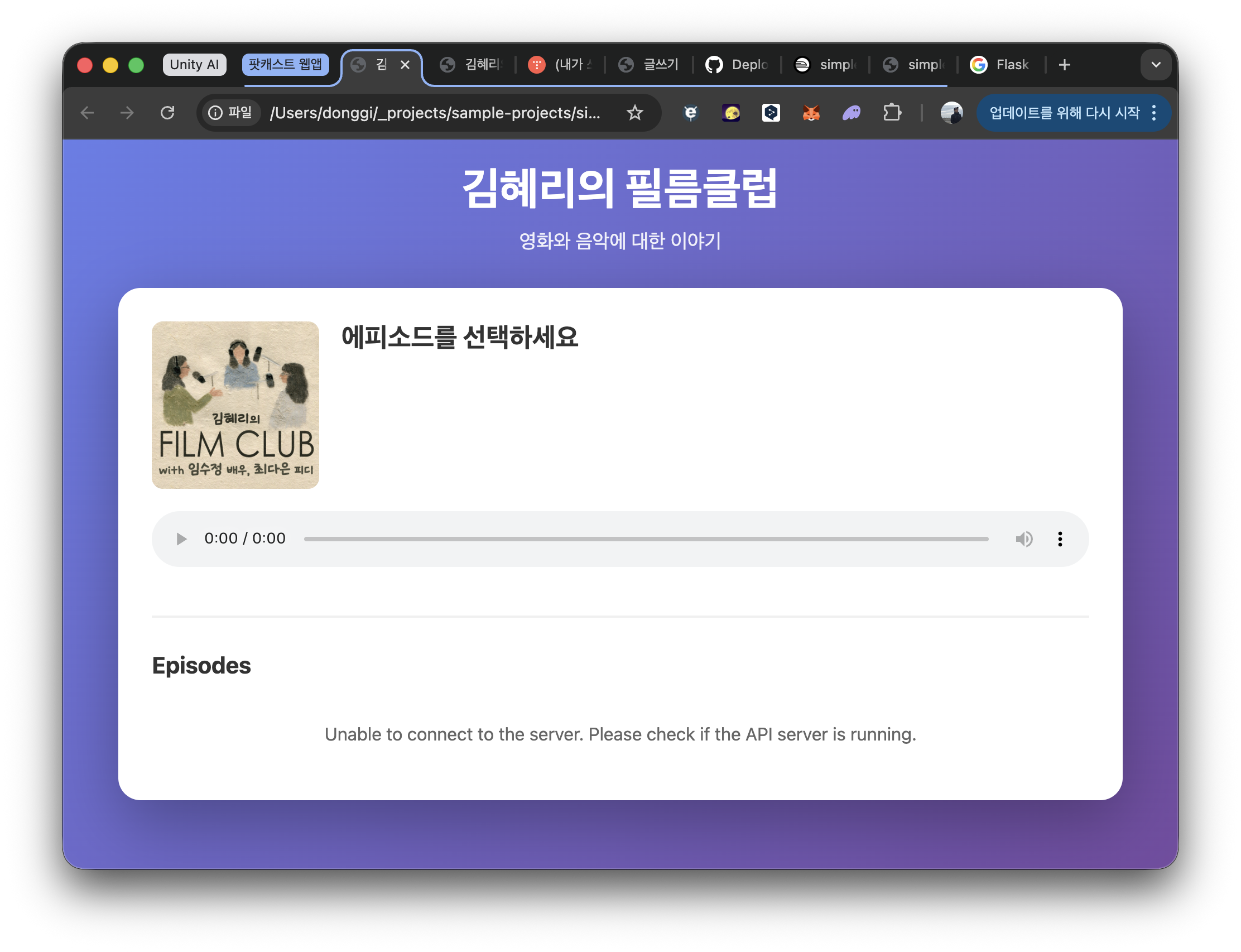 스크롤을 쭉쭉 내려보면 전체(314개) 에피소드가 전부 표시된다. 새로 구현한 서버(백엔드)가 RSS(XML)을 얻어오고, 이를 파싱해서 웹앱(프론트엔드)에 전달하면 이를 화면에 뿌려준다. 서버가 떨어지면 아래와 같이 뜨도록 예외처리까지 구현했다.