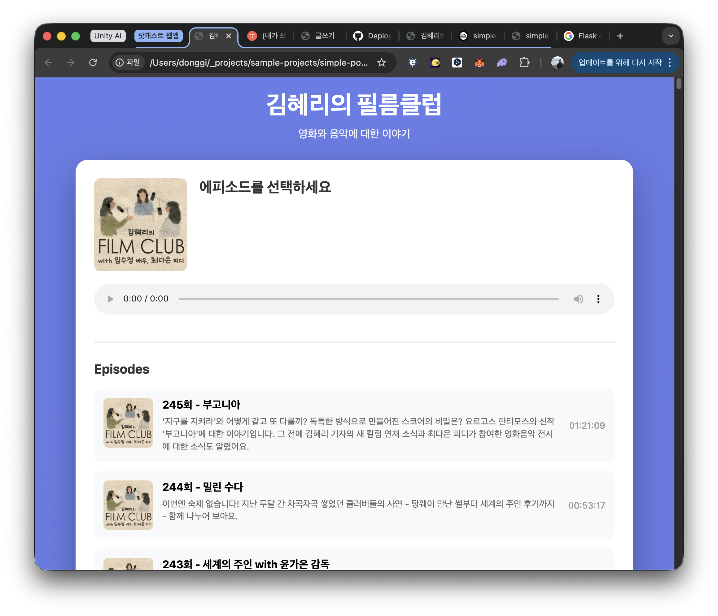 위와 같이 app.js 스크립트에 다섯 개의 에피소드를 하드코딩했던 코드를 걷어내고, 별도의 서버(백엔드)가 RSS feed URL로부터 전체 에피소드 리스트를 얻어오도록 했다. 큰 그림은 ChatGPT에게 물어보고 실제 코드 작업은 이번에도 Claude Code에게 시켰다. 백엔드는 python 기반의 웹 프레임워크인 Flask를 사용해서 구현했다. 참고로 Flask라는 놈도 이번에 처음 알게 됐다. Claude Code가 제안한 몇 가지 안에 node.js, next.js 등도 있었는데 그나마 내가 javascript 코드보다는 python 코드가 보기 편해서 이걸로 결정했다. 뚝딱뚝딱하더니 아래와 같은 메시지를 뱉어내며 백엔드 서버 구현이 완료됐다.