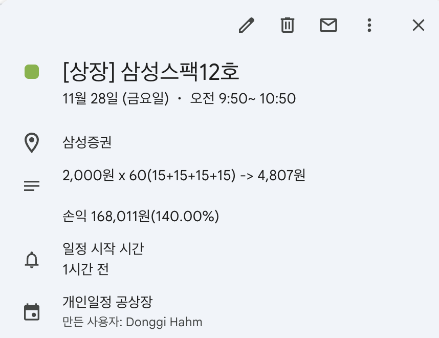 다행히 이런 식으로 상장일의 기록은 빼먹지 않고 구글 캘린더에 계속 올리고 있다. 오늘 11월 공모주 투자 결산을 Claude에 구글 캘린더를 연동해서 간단히 끝냈다. '해줘' 프롬프트로 바로 원하는 결과가 나왔다. 앞으로 미루지 말고 매달 올려야겠다.