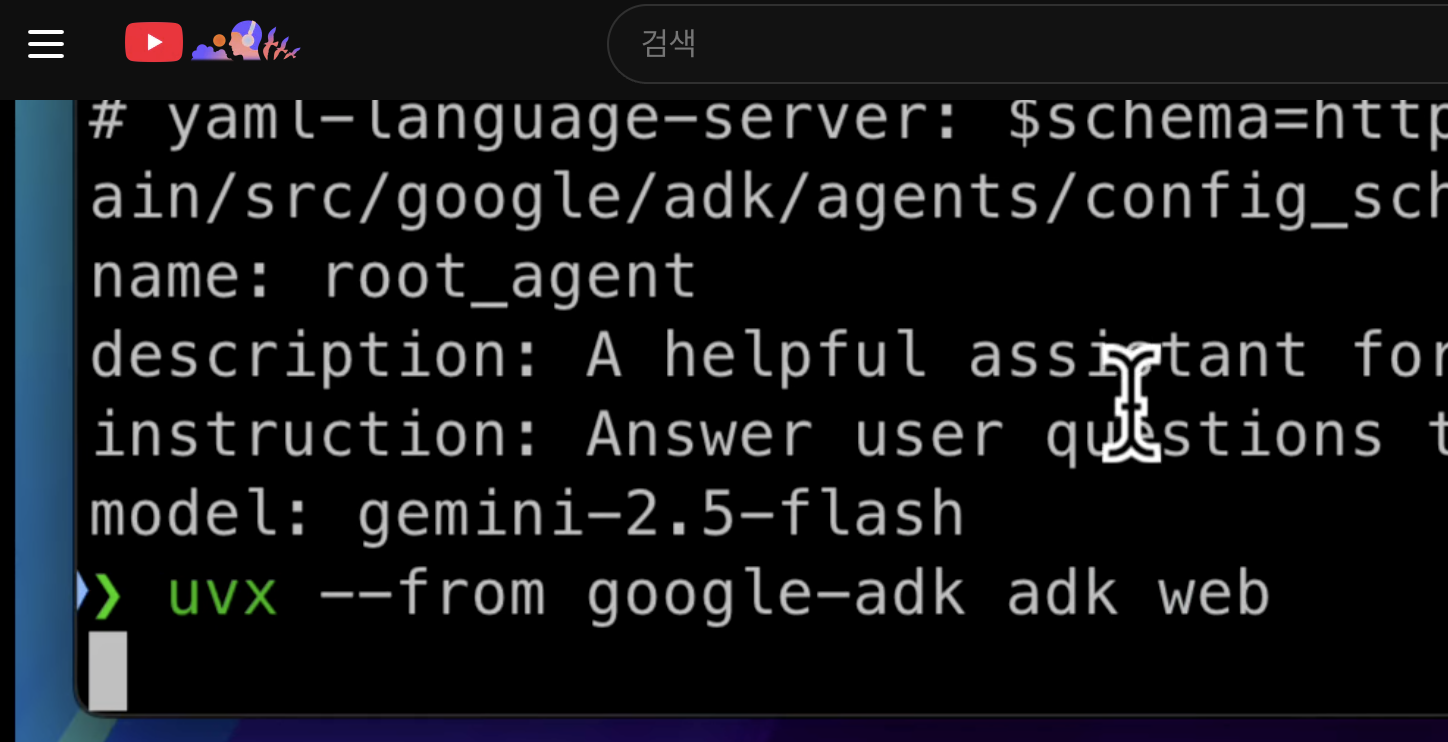노트북을 덮기 직전에 혹시나 하고 유튜브 영상과 2일 차 페이지에 적힌 명령어를 비교해 봤다. 띠용.. 영상에는 아래와 같이 프로젝트 경로명(my_agent/)이 빠져 있다.