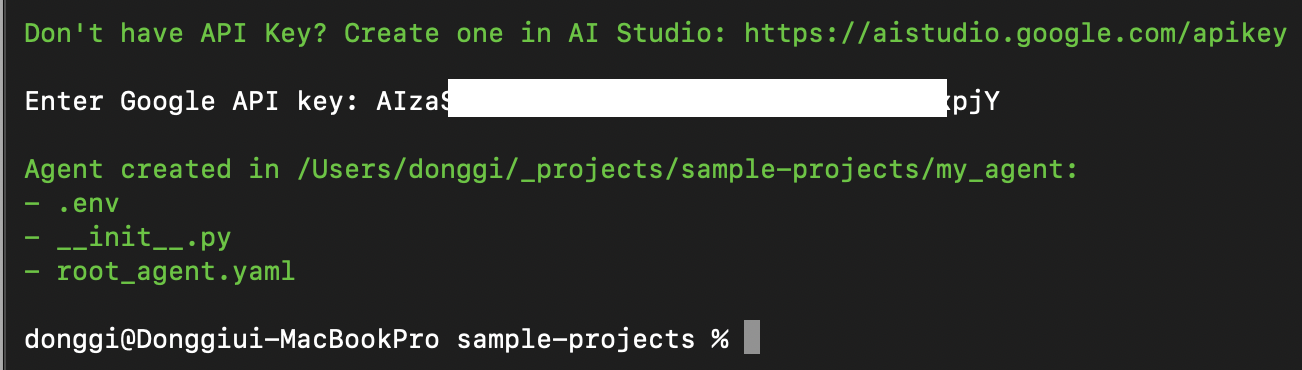 오.. 에이전트가 만들어진 것 같다. 중간에 api key를 생성해야 하는데 쓰여있는 대로 아래 Google AI Studio라는 페이지로 이동해서 프로젝트를 먼저 생성하고 대충 이름을 정해서 api key를 생성했다.