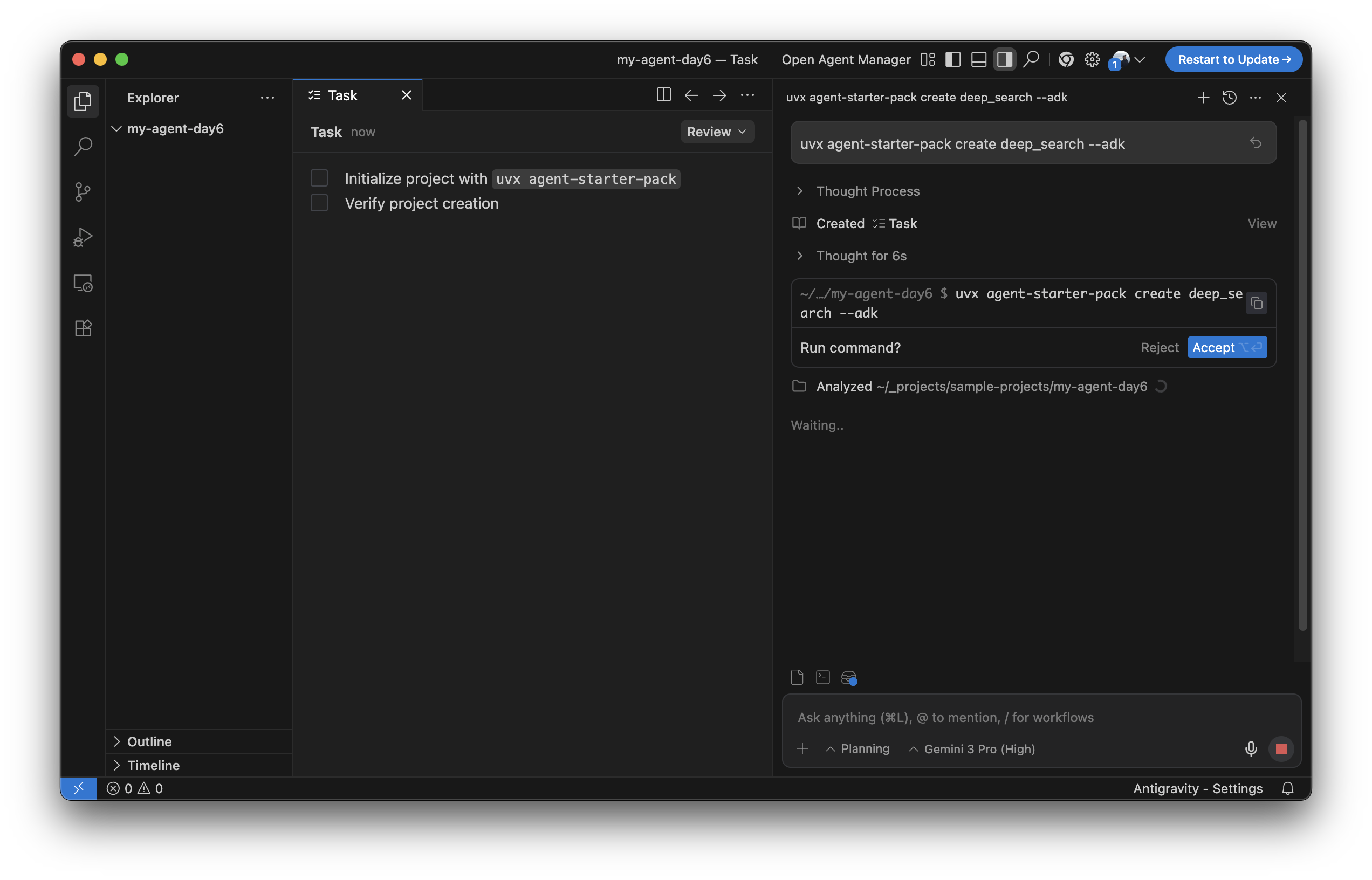 가이드 영상처럼 빈 프로젝트를 하나 생성하고, 앞의 한 줄짜리 명령어를 터미널이 아닌 agent view(Antigravity의 채팅 창)에 바로 입력했다. 스크린샷에 표시된 것처럼 AI 모델은 Gemini 3 Pro를 사용하고 있다.