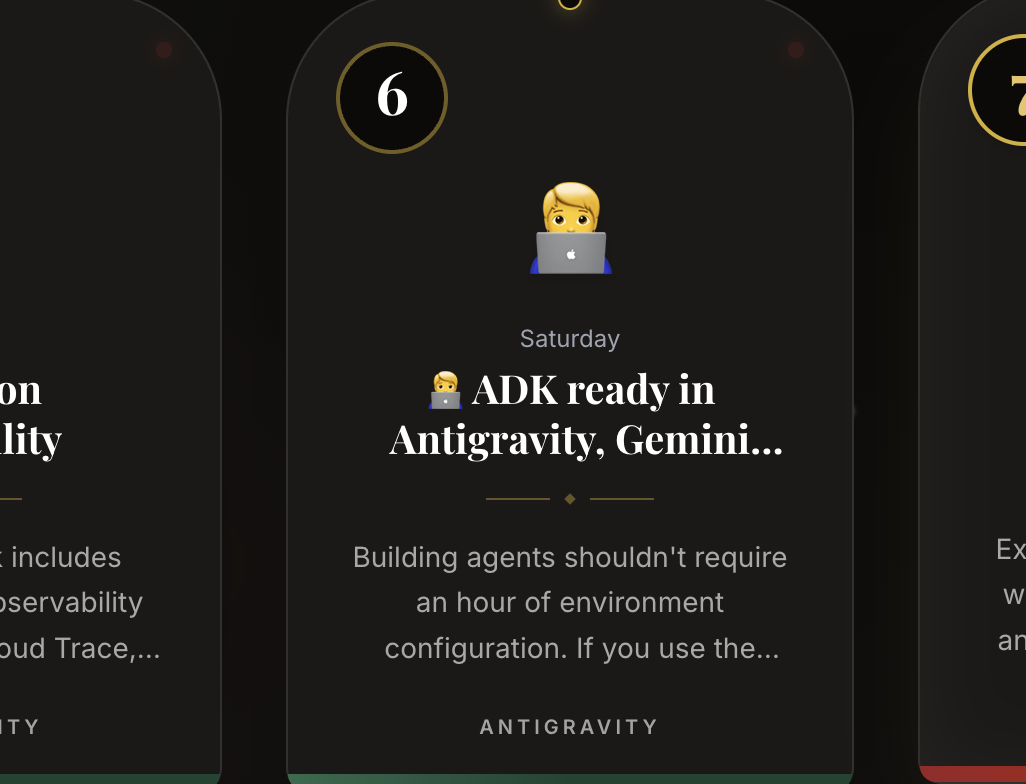 구글 Advent of Agents 2025 따라 하기, 벌써 6일 차에 접어들었다. 오늘의 키워드는 최근 구글이 출시한 바이브 코딩 도구, 'Antigravity'다. Antigravity는 설치만 해 놓고 아직 써 본 적이 없는데 마침 잘 됐다고 생각했다. 아, 그리고 이제 발견했는데 매 회차에 키워드가 있었다. 1일 차는 'LAUNCH', 2일 차는 'ADK', 3일 차는 'GEMINI 3', 4일 차는 'AGENT ENGINE', 그리고 5일 차는 'OBSERVABILITY'였다.