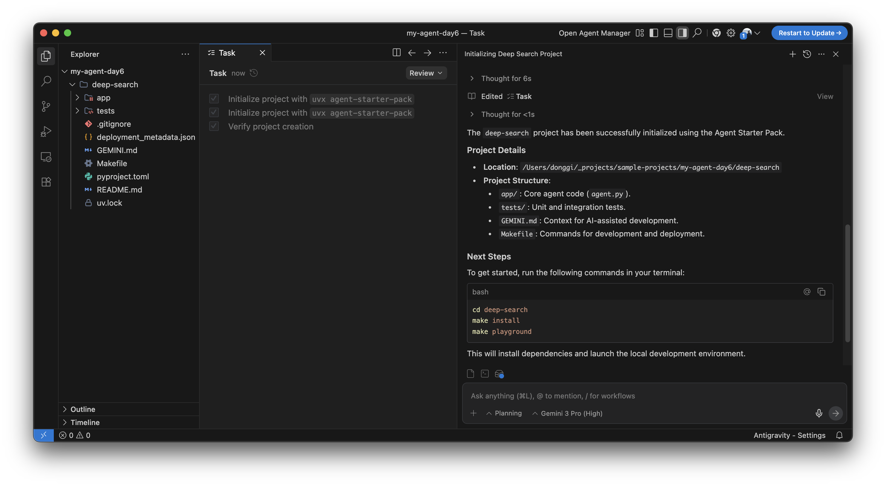 중간에 accept를 한 번 클릭했을 뿐, 잠깐 기다리만 했는데 deep search 기능을 수행하는 agent를 만드는 프로젝트가 생성됐다. agent view의 Next Steps 항목에 표시된 대로 터미널 상에서 deep-search 디렉터리로 이동해서 'make install'을 입력했다.