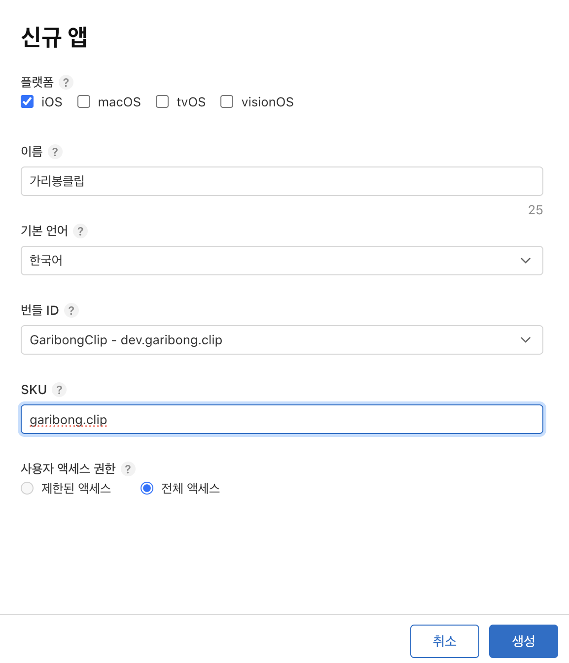 이런 팝업이 뜨는데 적당히 넣어주고 '생성'버튼을 클릭한다. 참고로 번들 ID 값은 미리 생성한 "dev.garibong.clip"을 선택했고, SKU는 일반적으로 번들 ID의 두 블록을 쓴다고 해서 "garibong.clip"으로 했다. 사실 생성했던 번들 ID 값은 "dev.garibong.audioclip"이었는데 중간에 좀 꼬여서 새로 생성했다.