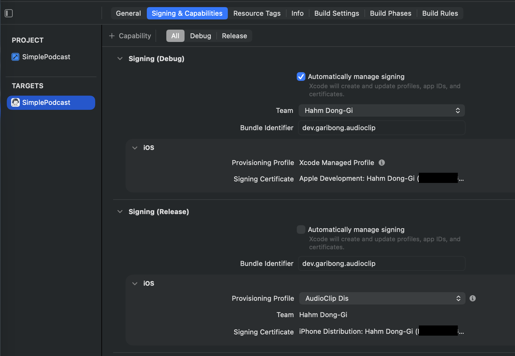 가이드 블로그에서는 Debug, Release 둘 다 Automatically manage signing 항목을 체크 해제했는데 Debug 쪽은 이렇게 하면 Provisioning profile이 signing certificate을 포함하지 않고 있다는 오류가 발생한다. 이런저런 시도를 해봤는데 해결이 안 돼서 그냥 Automatically manage signing를 체크한 채로 뒀다. Deubg 빌드 및 테스트 기기 인스톨에 문제가 없기 때문에 나중에 다시 보기로 하고 넘어간다.