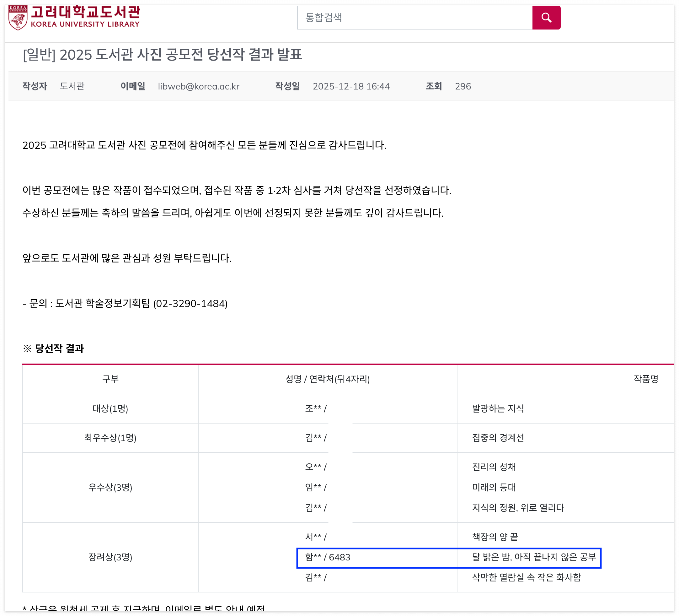 과장 좀 보태서 이번 학기를 한 문장으로 요약하면 '시험은 시원하게 말아먹었지만 상장 하나는 건진 학기'라고 할 수 있겠다. 대략 한 달 전에 제출하고 잊고 있다가 문득 생각이 나서 도서관 홈페이지에 들어갔다. 그리고 대략 일주일 전에 올라온 당선작 발표 공지 글을 확인할 수 있었다. 아직 개별 이메일 안내 및 상금은 전달받지 못했다.