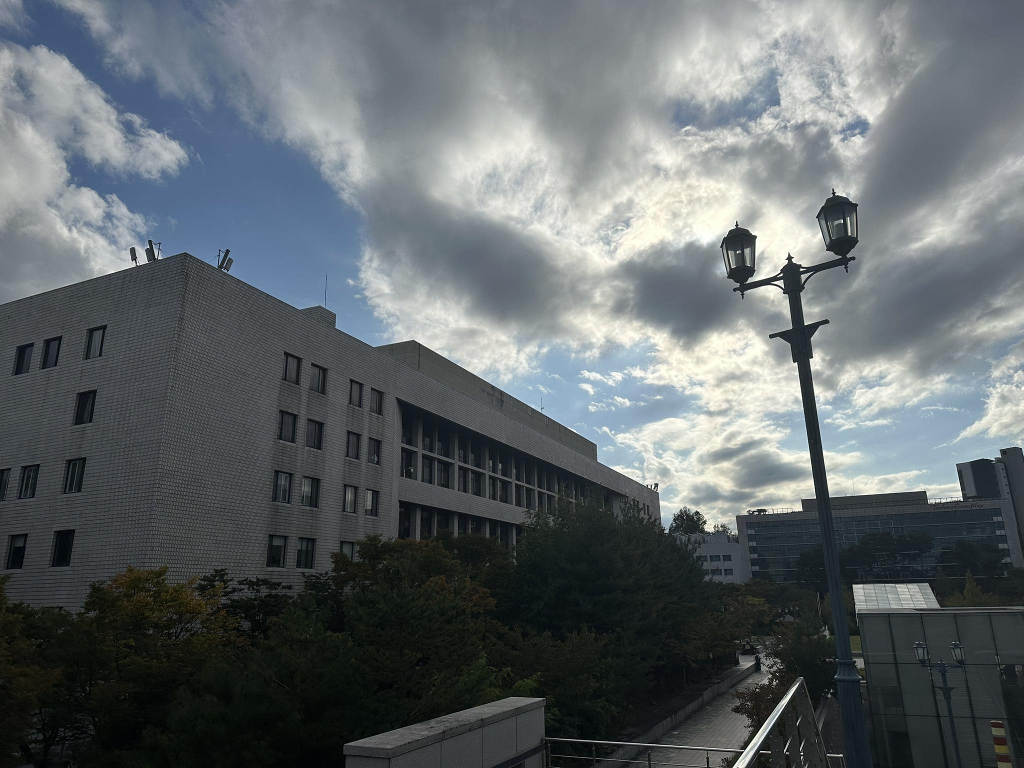 설명: 흐린 하늘을 배경으로 선 가로등이 영국 추리소설의 한 장면처럼 과학도서관 앞 길을 비춘다. 창문 너머로는 연구와 공부에 몰두한 이들의 시간이 조용히 흐르고, 나무로 둘러싸인 산책로는 또 다른 이야기가 시작될 것 같은 긴장과 설렘을 품고 있다. 이곳에서 고대인의 학문적·문화적 일상은 한 편의 소설처럼 이어진다.
