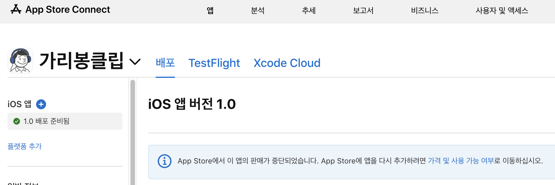 앱이 'App Store에서 제거됨' 상태로 변경돼 있었다. 모바일 앱에서는 제거 사유나 이후 어떻게 하라는 내용이 보이지 않았다. 서둘러 맥북을 열고 App Store Connect 맥앱을 실행시켰다.
