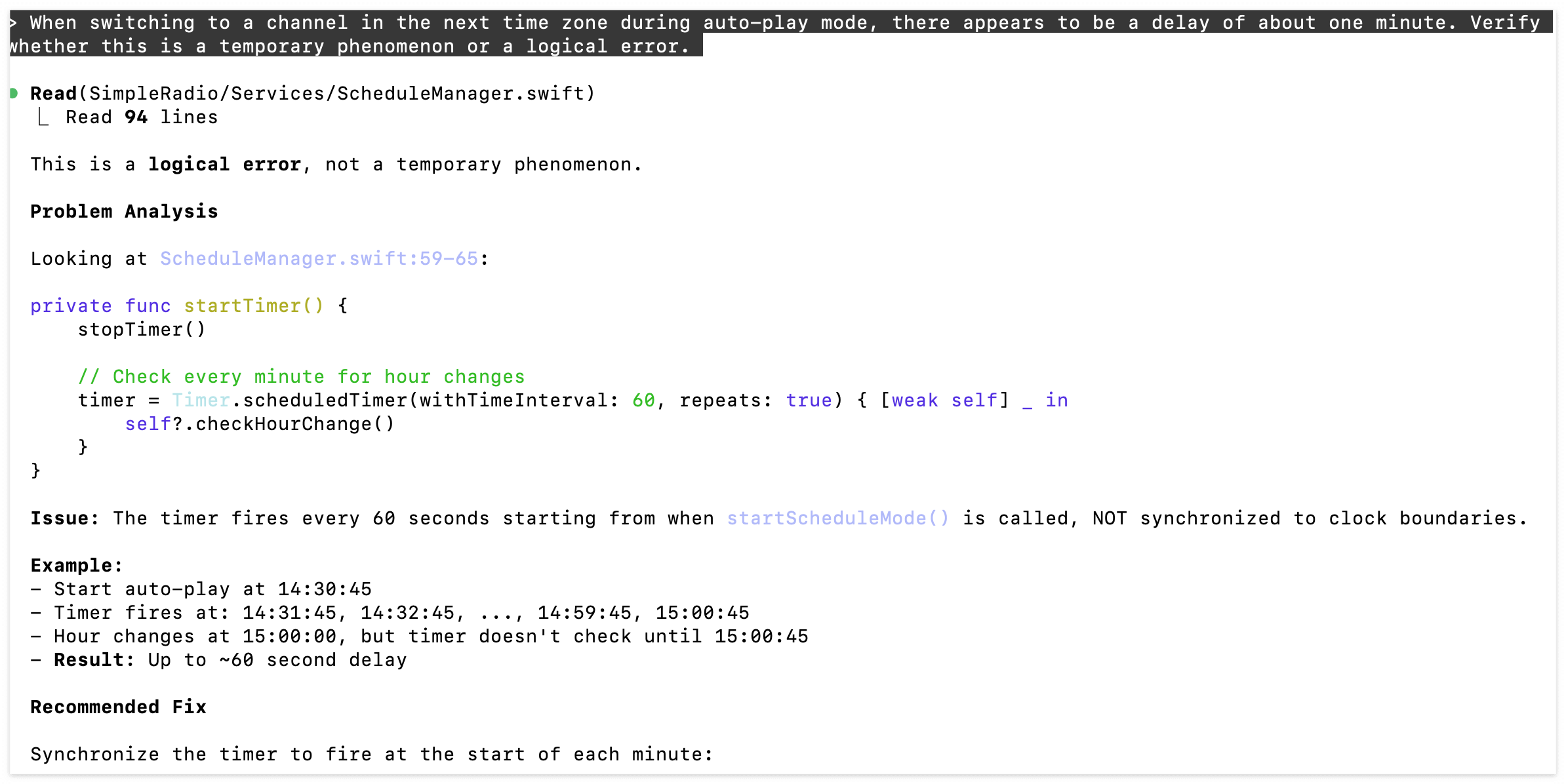 이 앱에는 '채널 선택' 모드와 '자동 재생' 모드가 있다. 채널 선택 모드는 말 그대로 특정 방송국의 채널을 선택해서 듣는 일반적인 모드다. '자동 재생' 모드가 다른 앱과의 차별점인데 한 시간 단위로 시간대별로 채널을 설정해 두면 자동으로 채널이 변경되며 재생되는 모드다. UI 디자인이 좀 아쉽지만 (내가 보기에는) 기능 상 나무랄 데가 없다. 하루 만에 만든 앱이지만 프롬프트 한 번에 지금의 결과물이 바로 나온 것은 아니다. 버그가 적지 않았는데 케이스 하나만 기록으로 남긴다. 아래 스크린샷은 심사 넣기 직전에 버그를 수정한 내역이다.