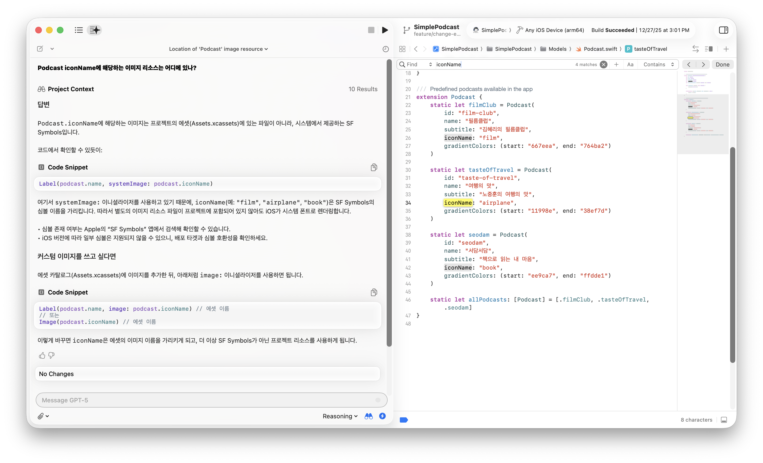 Xcode를 열고 Coding Intelligence에 활성화시켜 둔 ChatGPT에게 이거 어디 있냐고 물어봤다.