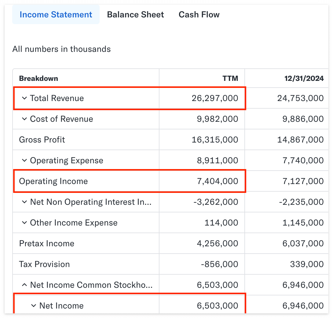 손익계산서에서 매출액(Total Revenue), 영업이익(Operating Income), 당기순이익(Net Income)을 확인하고 당기순이익률까지 계산해 보겠다. 최근 12개월(TTM) 매출액은 약 262억 달러, 영업이익은 약 74억 달러, 당기순이익은 약 65억 달러다. 당기순이익을 매출액으로 나눈 당기순이익률은 약 24.7%다. 당기순이익률이 20% 이상이면 정말 훌륭하다고 볼 수 있는데 준수한 수준이다. 처음으로 긍정적인 수치가 나왔다.