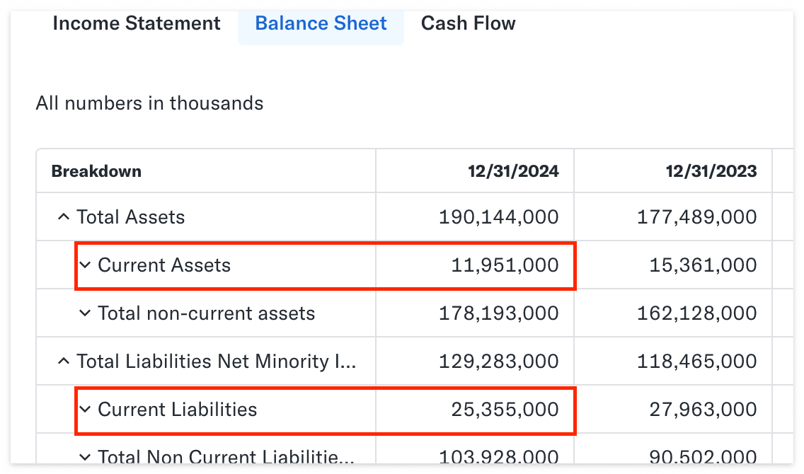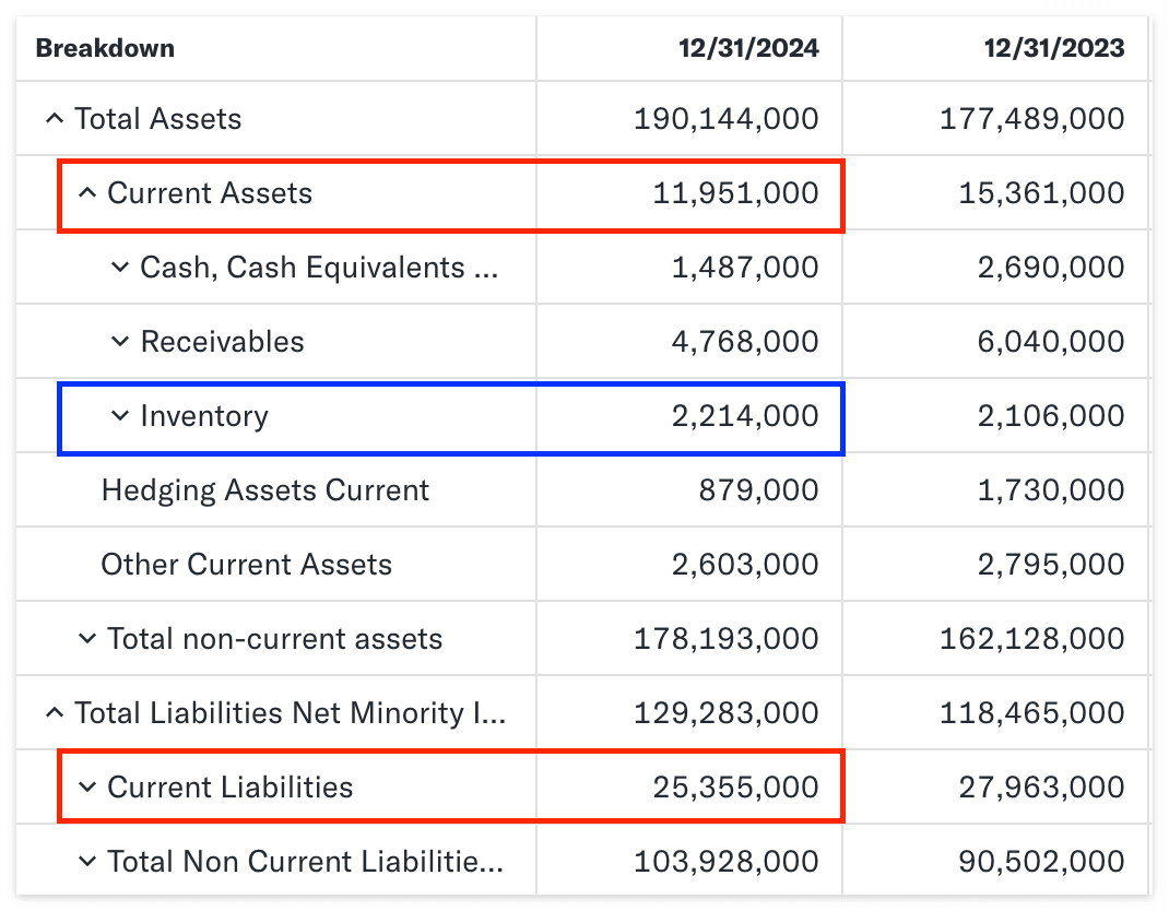 유동자산(Current Assets)은 119억 달러, 유동부채(Current Liabilities)는 253억 달러로 유동비율은 약 47.1%로 상당히 불안한 수준이다. 다음으로 유동자산에서 재고 자산을 뺀 값을 유동부채로 나눈 당좌비율을 알아보겠다.
