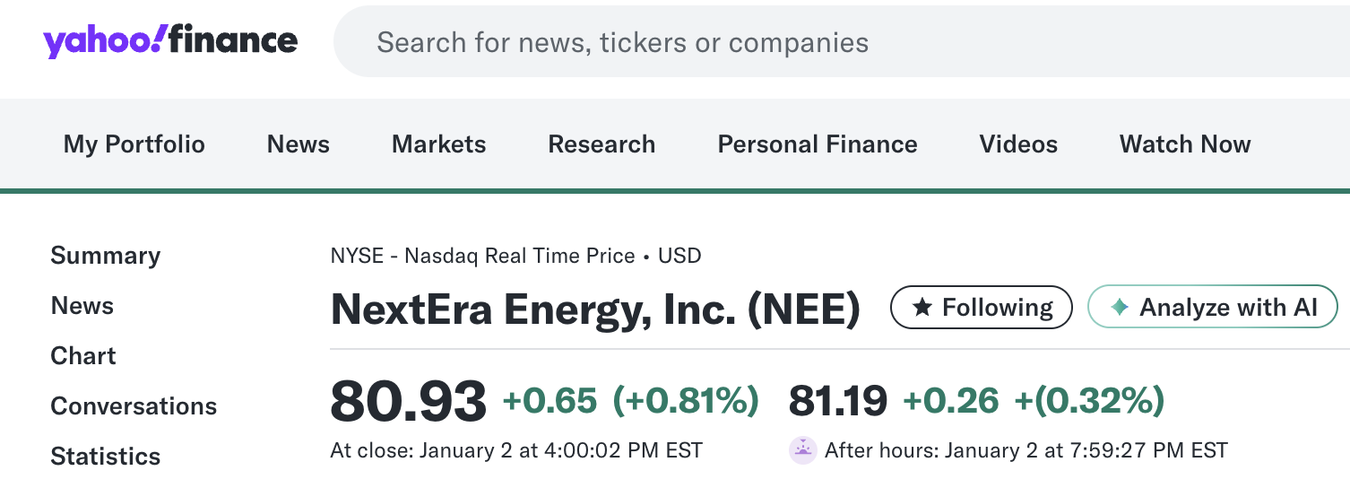 Yahoo Finance 사이트에서 티커 'NEE'로 검색해서 '넥스타레 에너지' 페이지로 들어간다. 왼쪽 사이드 메뉴에서 'Financials'를 클릭한다.