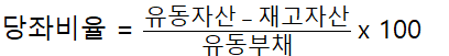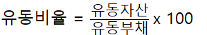 유동비율은 다음과 같이 구하고 최소 100% 이상 돼야 안정적이라고 평가할 수 있다.
