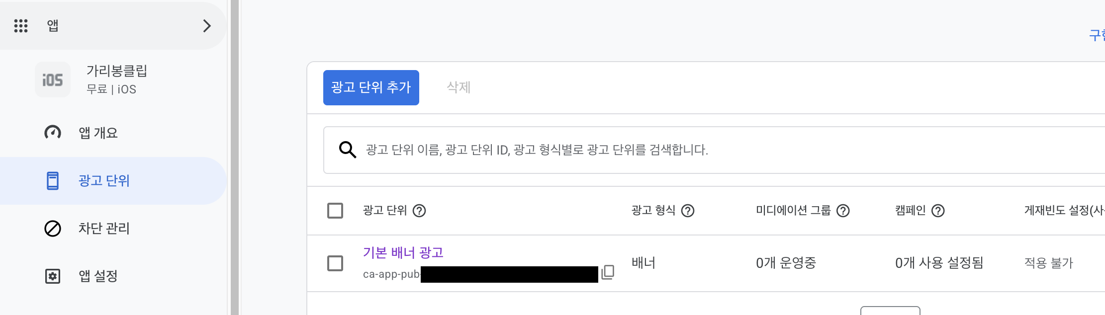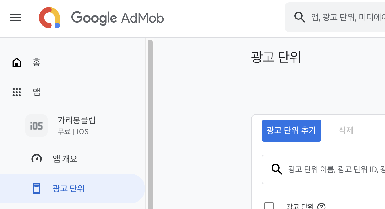 '광고 단위' 메뉴로 진입한 뒤 '광고 단위 추가' 버튼을 클릭했다.