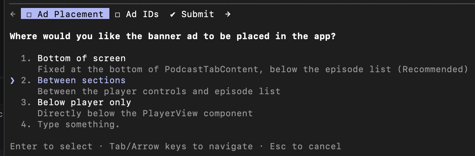 Claude는 스크린 제일 아래를 추천했는데 수백 개의 에피소드 아래에 배너를 배치한다는 것이 잘 이해가 되지 않았다. 그래서 플레이어와 에피소드 리스트 사이에 위치하도록 하는 두 번째 선택지를 선택했다.