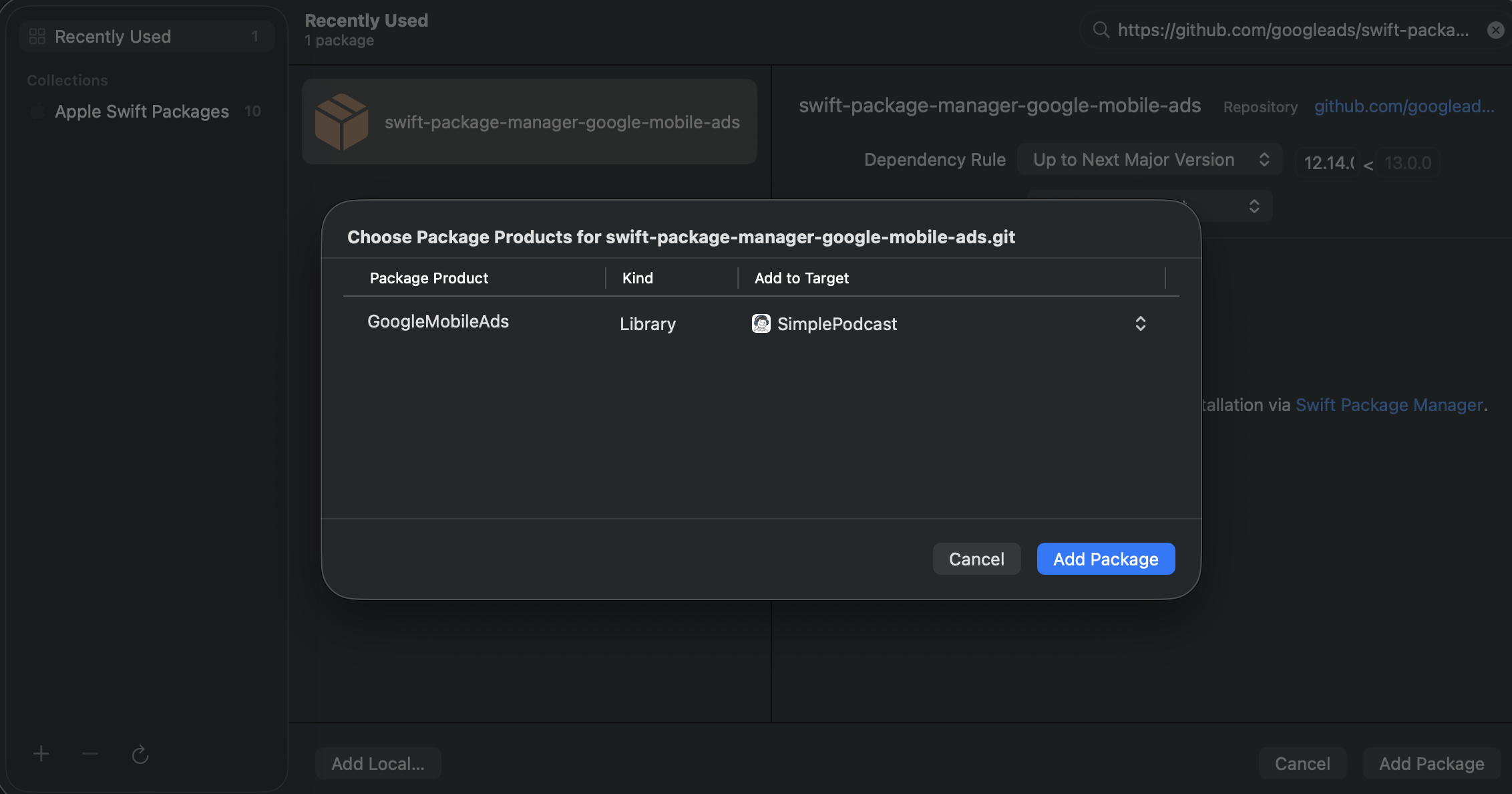 2. Enter URL: https://github.com/googleads/swift-package-manager-google-mobile-ads.git