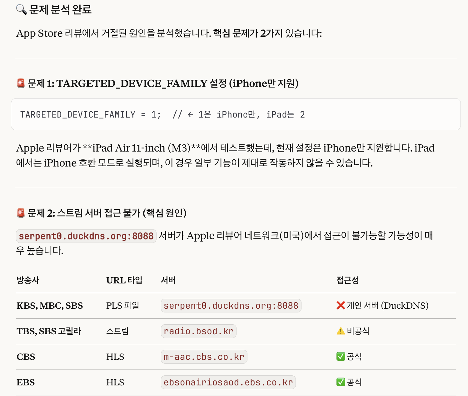앱의 버그로 인한 리젝이다. 재생 버튼을 터치해도 아무 소리도 나지 않는다고 기재돼 있다. 이건 좀 의외였다. 여러 번 테스트했지만 동작 자체가 안 된 적은 없었다. 리젝 사유 문구를 그대로 긁어서 프로젝트 코드를 알고 있는 Claude에게 물어봤다.