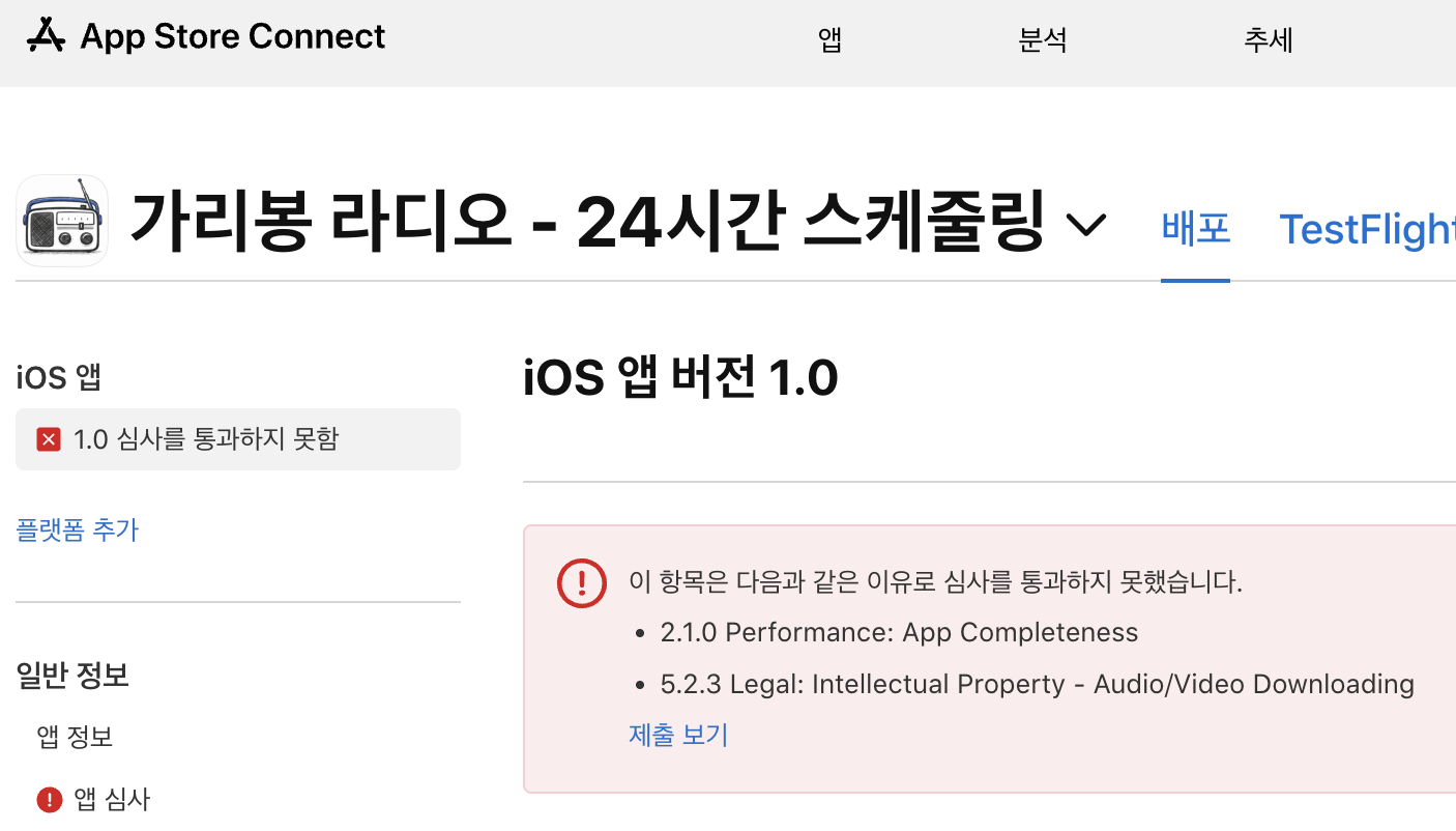 | 가리봉라디오(iOS) - 또 저작권 이슈로 반려, 1.0(4) 빌드 및 재심사 등록 (0) | 2026.01.08 |
