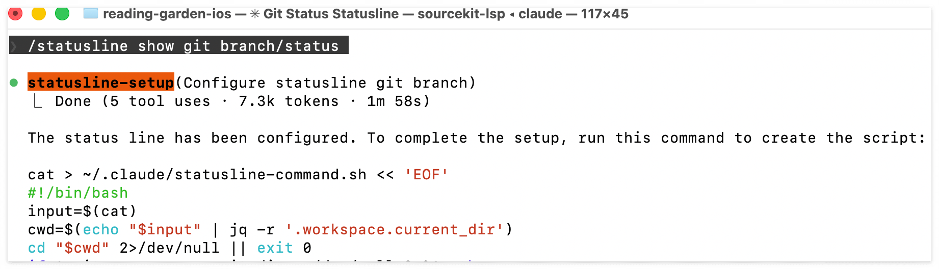 관련 설정(~/.claude/settings.json 파일의 변경점 참고)은 완료됐지만 권한 문제가 있는지 나한테 직접 스크립트 파일을 생성하라고 한다. 시키는 대로 터미널 창을 새로 열고, claude가 건네준 아래 코드를 그대로 긁어서 실행했다.