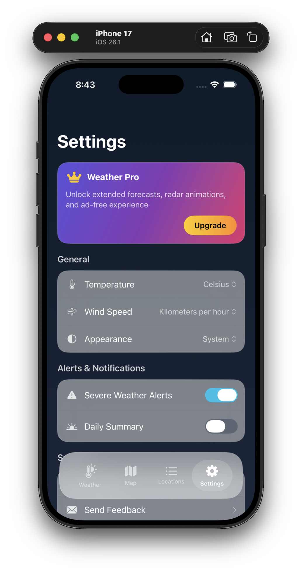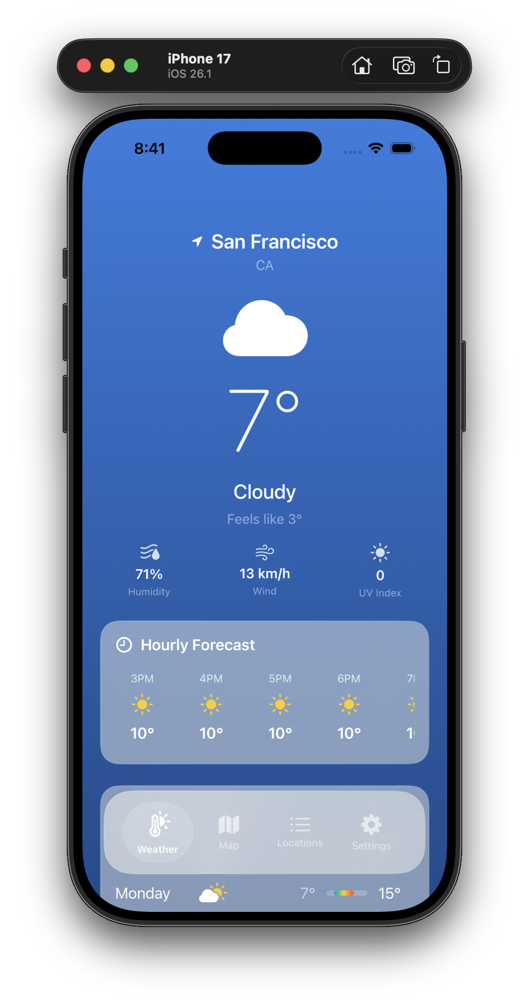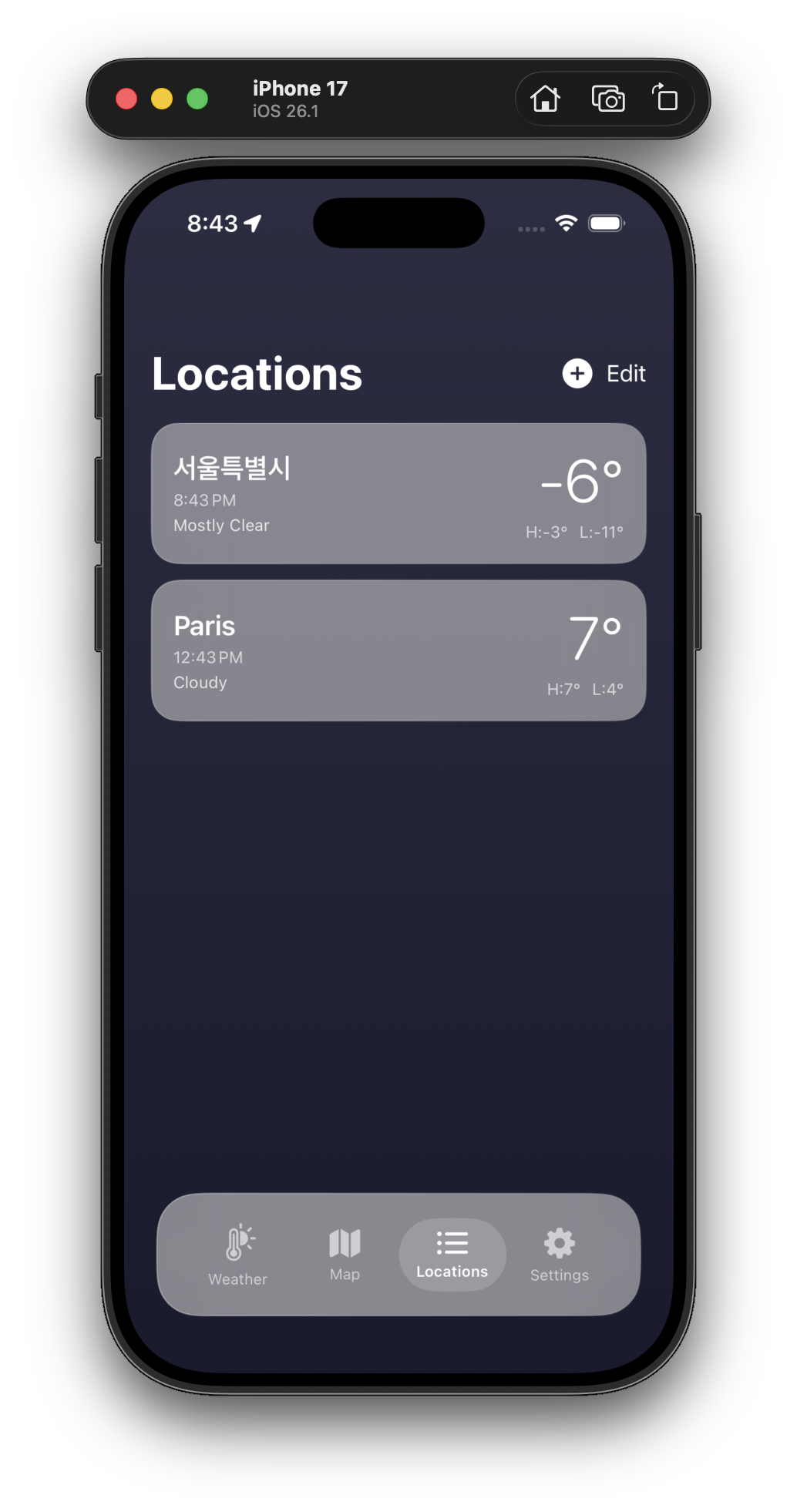 이전에 만든 앱들에 비해 구조가 복잡한 앱이라 그런 듯하다. 이제는 서브에이전트(subagent)를 이용해서 세션을 여러 개 띄우고 병렬로 작업하는 것을 고려할 때가 됐나 보다. 현재 위치한 지역의 날씨 정보를 표시하는 기능, 지역을 추가해서 리스트로 관리하는 기능, 화씨/섭씨 변경 기능 등 날씨 앱의 핵심 기능이 잘 동작하는 준수한 결과물이 나왔다. 물론 바로 출시할 수 있는 수준은 아니다.