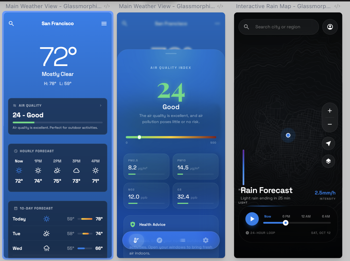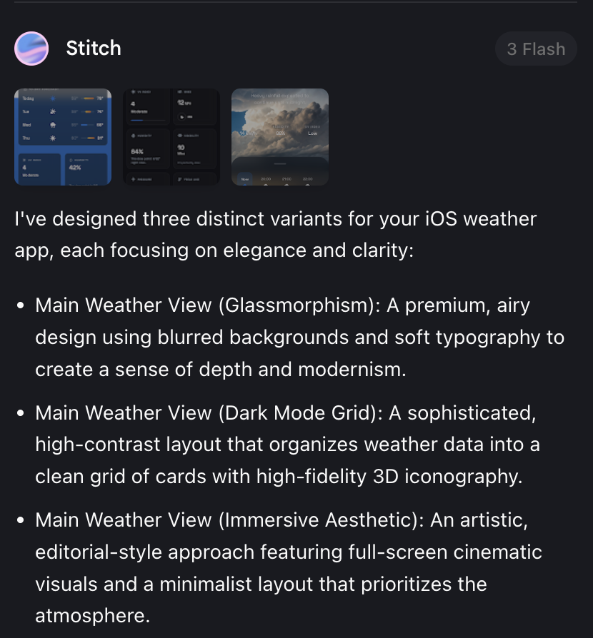 다음부터는 첫 프롬프트에 elegant, gorgeous 같은 뻔한 단어 쓰지 말고, (Glassmorphism 같이) 원하는 스타일에 해당하는 단어를 넣어야겠다. 이렇게 하면 stitch가 여러 스타일의 버전을 뽑아내고, 나는 또 그중에서 하나를 선택하는 단계를 줄일 수 있으니까.