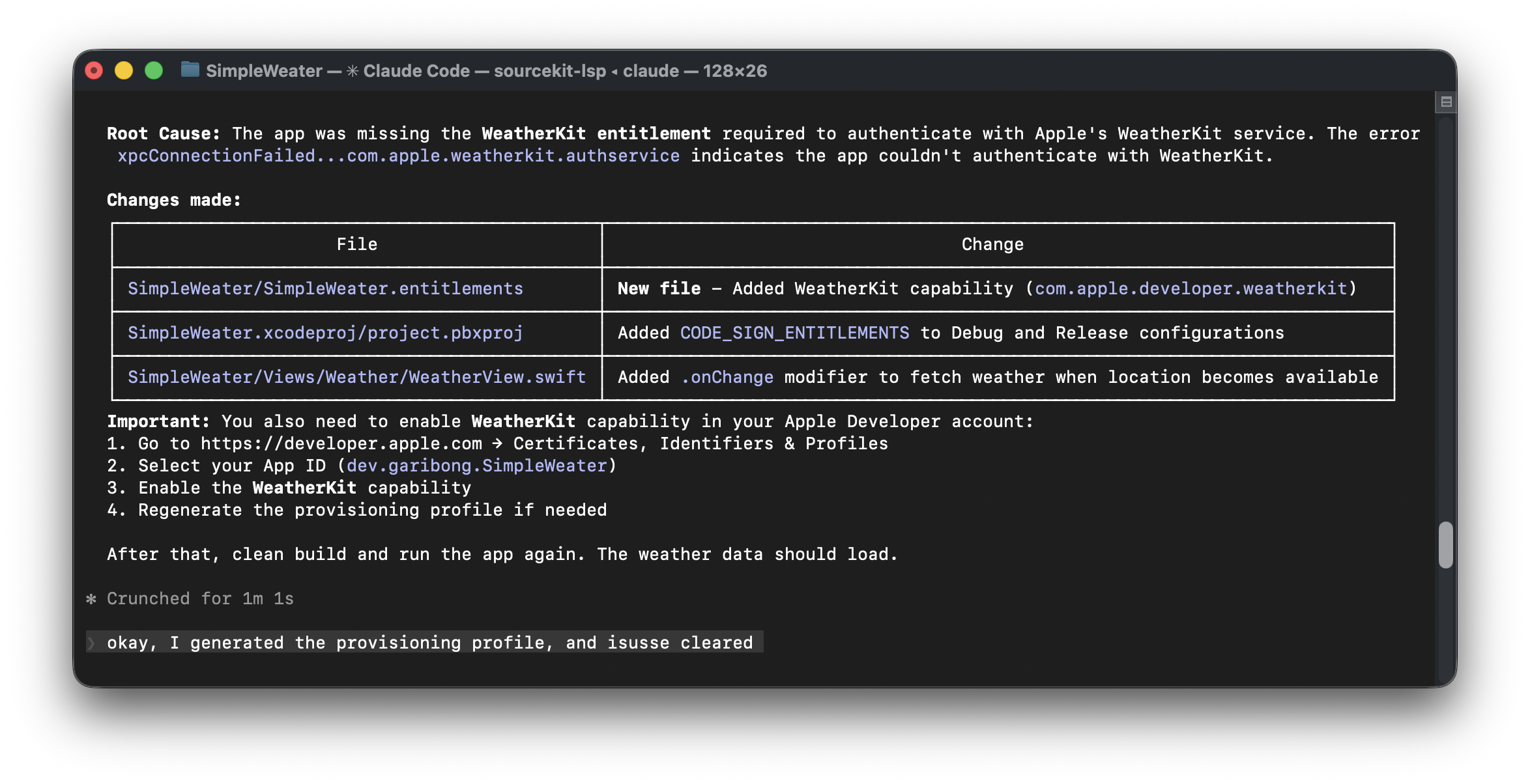 Provisioning Profile에 WeatherKit Capability를 활성화해서 재생성하라는 답이 바로 나왔다. 사실 귀찮아서 아예 Provisioning Profile 없이 구현 작업을 시작했다. claude code한테는 비밀이다. WeatherKit Capability를 체크하고 Provisioning Profile을 생성해서 프로젝트에 적용했더니 오류가 해결됐다.