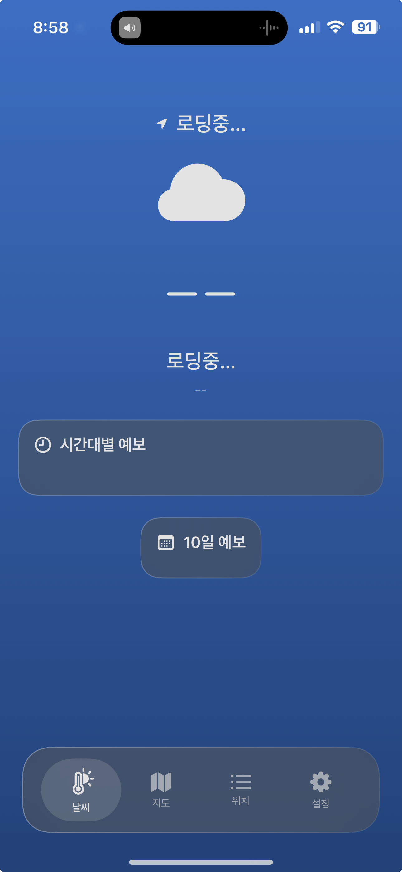 물론 아무 문제 없이 구현이 한 번에 끝난 건 아니다. 코드 구현 문제가 아닌 인증서 관련 문제로 앱이 제대로 동작하지 않았던 상황이 있었다. 이를 간단히 정리해서 공유한다. 구현 완료 후 바로 실행해 봤는데 시 아무리 기다려도 '로딩 중..' 문구가 사라지지 않고, 위치 및 날씨 정보가 표시되지 않았다.