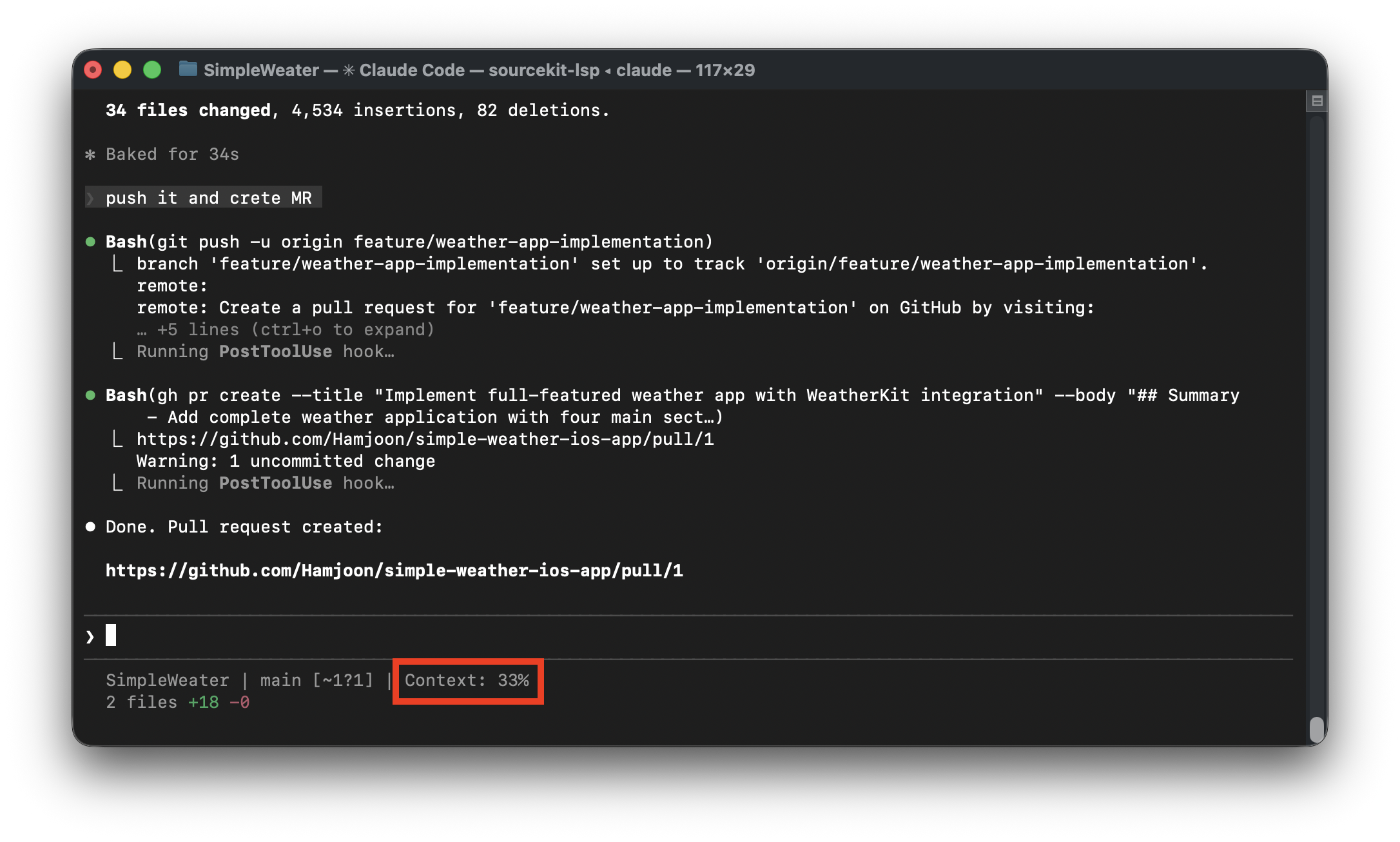 이후 구현은 accept edits 모드로 claude code가 쭉 진행했기 때문에 따로 언급할 부분이 없다. 다만 진행 중에 세션의 잔여 Context가 쭉쭉 떨어져서 auto-compact가 발동될 위기가 있었다. 다행히 33%에서 작업이 완료됐다.