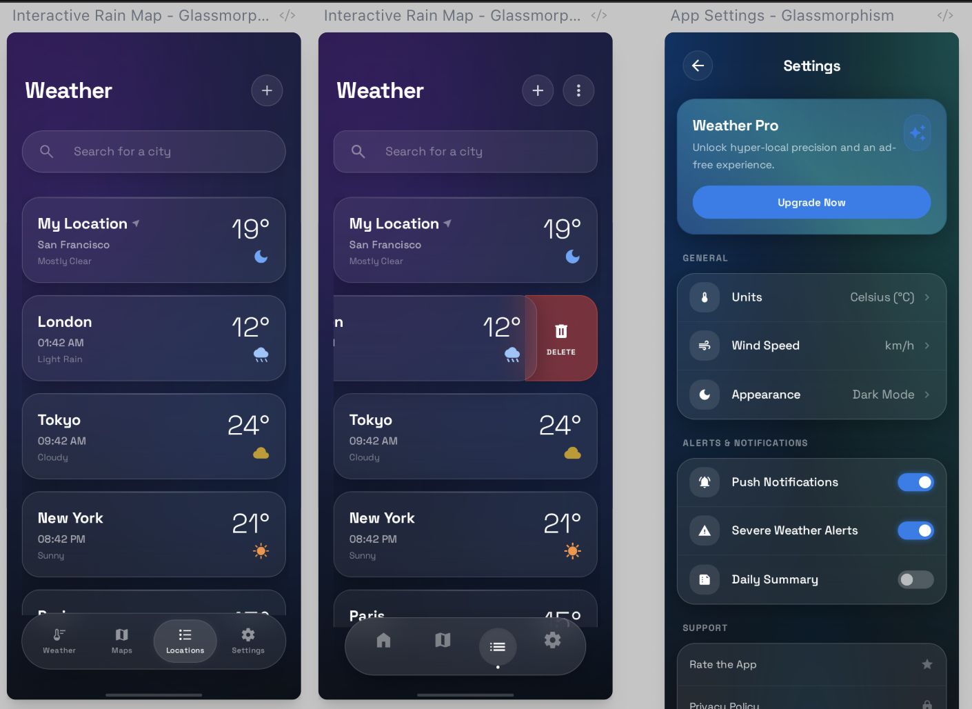 - Features a vertical list of saved cities displayed as elegant, translucent glass cards against a soft