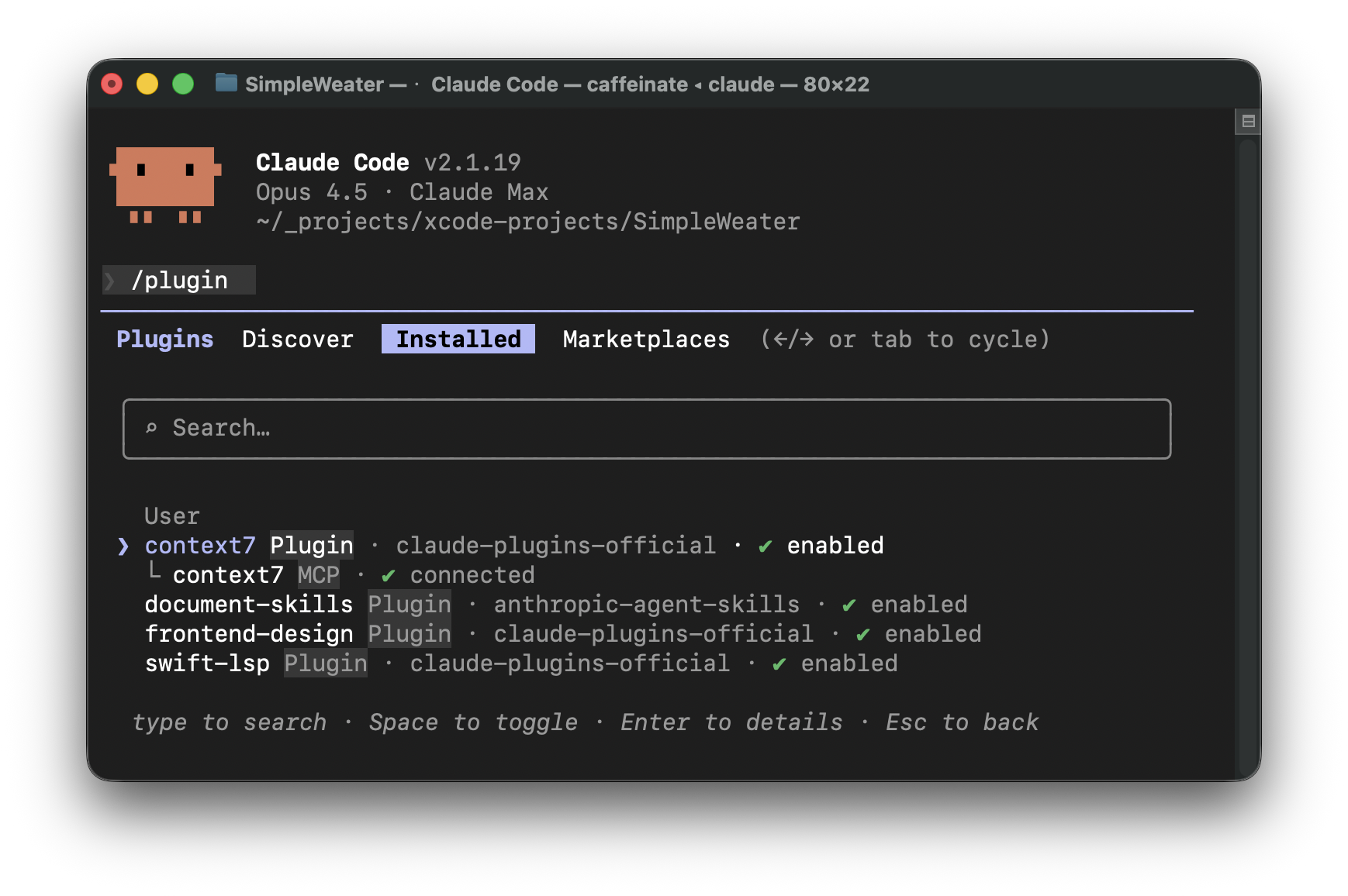 위와 같이 설치가 완료된 것을 확인할 수 있다. 나는 context7을 포함해서 네 개의 plugin을 설치해서 사용 중이다. frontend-design plugin은 이 글을 쓰는 도중에 설치했다.