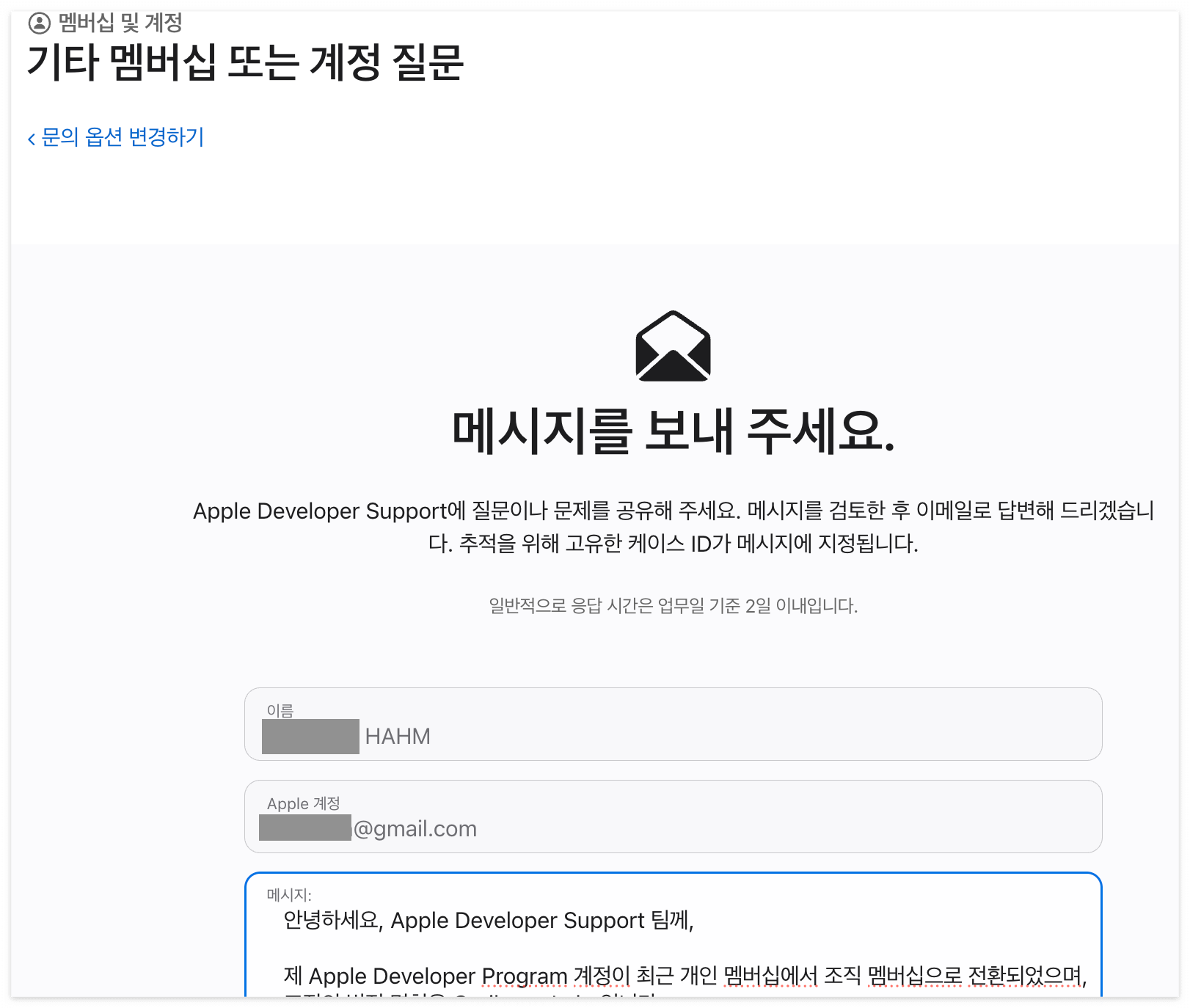 문의 유형은 '멤버십 및 계정' -> '기타 멤버십 또는 계정 질문'을 선택하고 아래와 같이 이름, Apple 계정, 메시지 란을 채워서 문의를 넣었다.