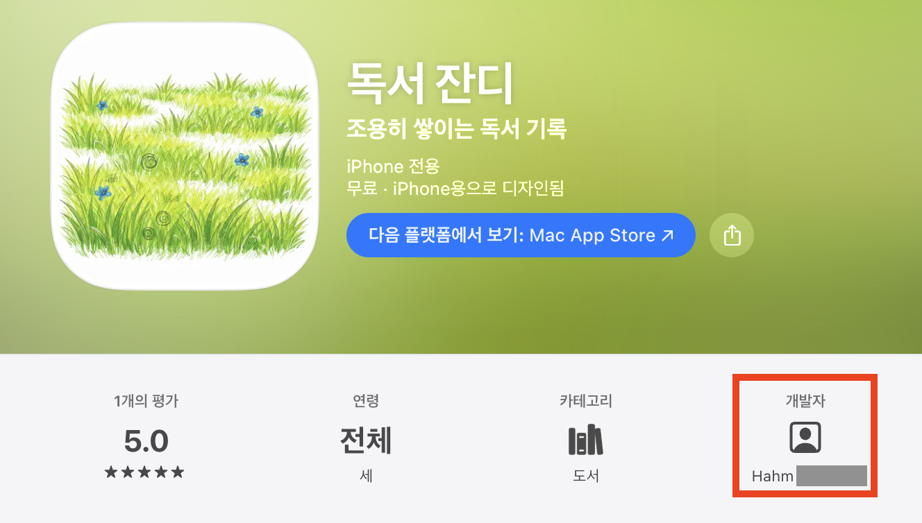 하지만 App Store 앱 페이지의 Developer 표시 이름이 여전히 제 개인 이름(Hahm ******)으로 표시되고 있습니다.