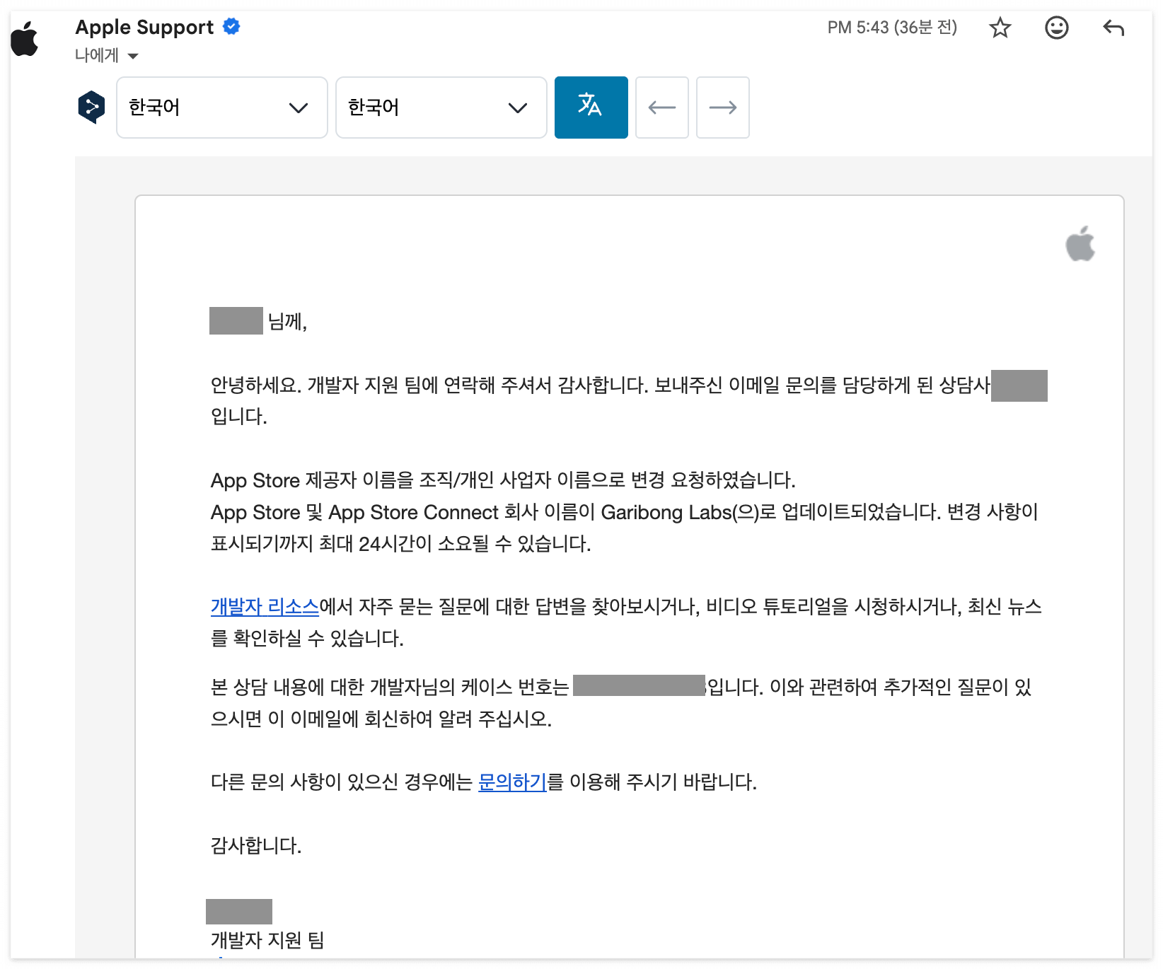 메시지 끝에 스토어에 올라간 앱의 링크(https://apps.apple.com/kr/app/id6757746167)를 추가로 적었다. 바로 시스템이 보낸 자동 발송 메일이 왔다. 그리고 잠시 후에 새로운 담당자에게 아래와 같은 메일이 왔다. 이번에는 너무 빠르게 처리돼서 정신이 없을 정도였다.