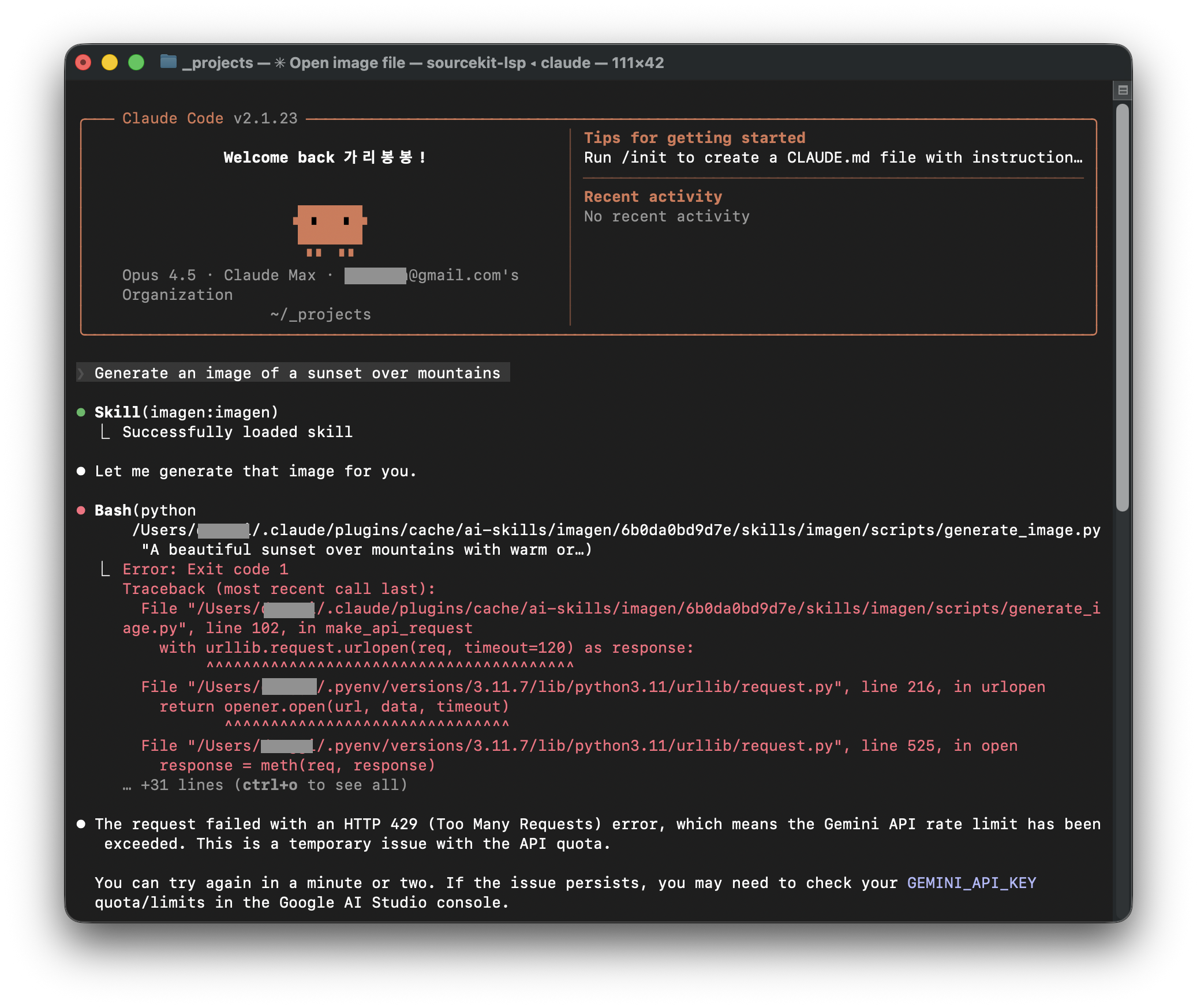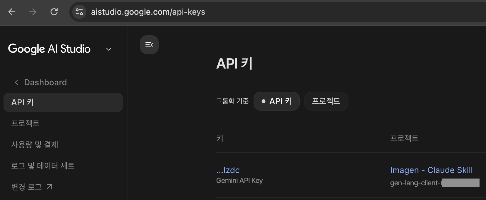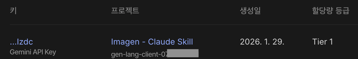 Skill 설치는 완료됐고, 이어서 Google API Studio 사이트에 접속해서 프로젝트를 하나 만들고 API 키를 생성했다.