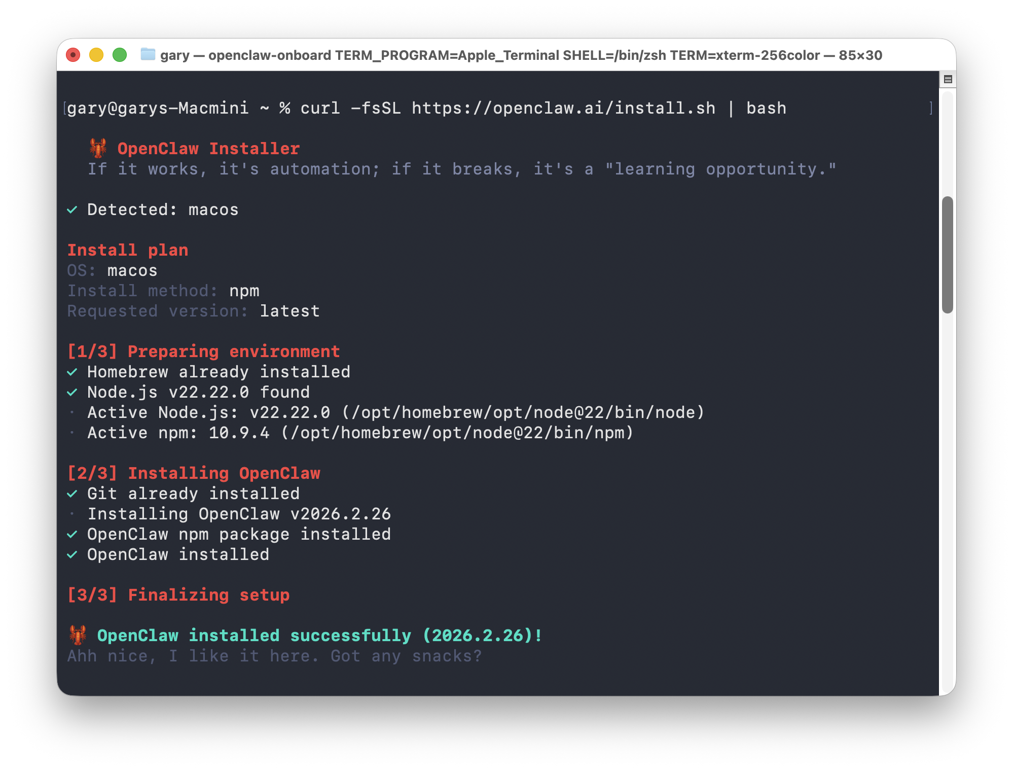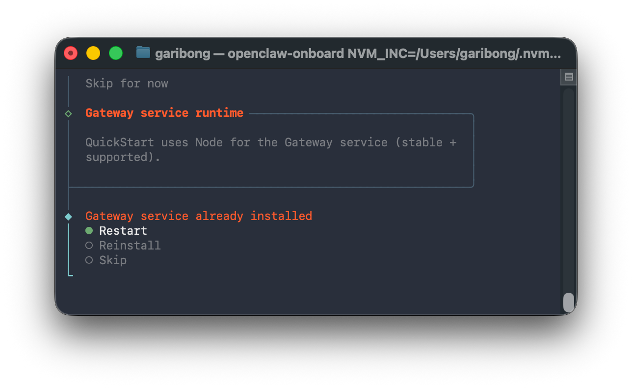 일반적인 프론트엔드 개발에서는 버전 전환이 쉬운 nvm을 많이 쓰지만, OpenClaw 같은 백그라운드 서비스(데몬)를 돌릴 때는 Homebrew로 설치하는 것이 훨씬 안정적이다. (나중에 맥을 재부팅했을 때 데몬이 Node 경로를 못 찾아서 뻗어버리는 불상사를 막을 수 있다.)