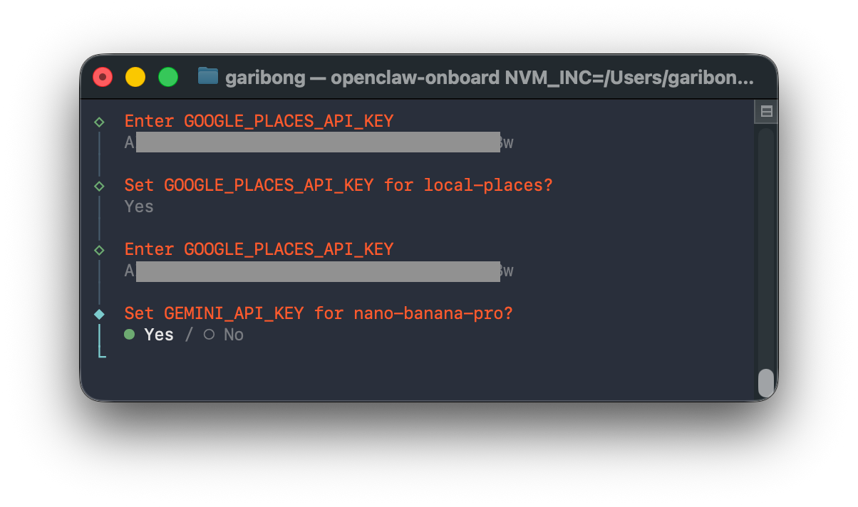 이번엔 이미지 생성에 사용할 Gemini API key를 입력하란다. 마침 이것도 며칠 전에 Claude Code에서 Imagen 스킬을 사용하는 작업을 할 때 생성해 둔 게 있다. 이런 우연이 있나!